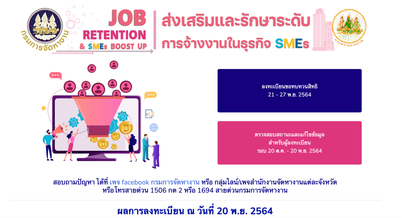 นายสุชาติ ชมกลิ่น รัฐมนตรีว่าการกระทรวงแรงงาน เปิดเผยว่า กระทรวงแรงงาน โดยกรมการจัดหางาน เปิดให้นายจ้างที่ลงทะเบียนร่วมโครงการส่งเสริมและรักษาระดับการจ้างงานในธุรกิจ SMEs ระหว่างวันที่ 20 ต.ค. – 20 พ.ย. 64 ซึ่งภายหลังลงทะเบียนมีสถานประกอบการบางแห่งที่ระบบแจ้งว่า "ขาดคุณสมบัติ" หรือมีการเปลี่ยนเจ้าของกิจการ เนื่องจากเจ้าของเดิมเสียชีวิต หรือสาเหตุอื่นๆ ก่อนวันที่ 16 ต.ค. 64 รวมทั้งกรณีอื่นๆ