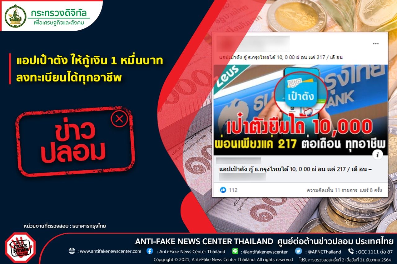 วันที่ 31 ธ.ค. 2564 ศูนย์ต่อต้านข่าวปลอม ประเทศไทย (Anti-Fake News Center Thailand) เปิดเผยถึงกรณีการโพสต์ให้ข้อมูลเกี่ยวกับการขอสินเชื่อกับธนาคารกรุงไทย หรือให้กู้เงิน 10,000 บาท ผ่านแอปพลิเคชัน “เป๋าตัง” ได้ทุกอาชีพนั้น ทางศูนย์ต่อต้านข่าวปลอม ตรวจสอบข้อเท็จจริงจากธนาคารกรุงไทย ชี้แจงว่า ปัจจุบันยังไม่มีบริการให้สินเชื่อผ่านแอปพลิเคชันเป๋าตัง ซึ่งแอปพลิเคชันดังกล่าวเป็นแพลตฟอร์มด้านการเงินระบบเปิด สามารถใช้บริการแม้ไม่มีบัญชีเงินฝากของธนาคารกรุงไทย ให้บริการครอบคลุมทั้งบริการกระเป๋าเงินอิเล็กทรอนิกส์ (E-wallet) รองรับการทำธุรกรรมโอนเงิน เติมเงิน และชำระค่าสินค้าและบริการ รวมถึงบริการกระเป๋าเงินอิเล็กทรอนิกส์ของภาครัฐ (G-wallet) รองรับการทำนโยบายของภาครัฐ บริการกระเป๋าสุขภาพ (Health Wallet) ตรวจเช็กสิทธิด้านสุขภาพผ่านเป๋าตัง บริการด้านการลงทุนพันธบัตรของรัฐผ่านวอลเล็ต สบม. รวมถึงบริการเกี่ยวกับกองทุนกู้ยืมเพื่อการศึกษา (กยศ.) ที่ช่วยให้การจัดการบัญชี กยศ. สะดวก และรวดเร็ว