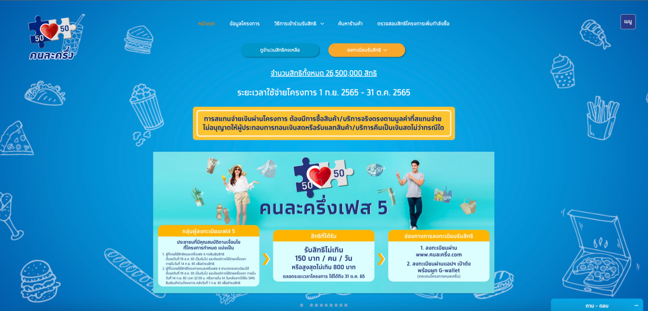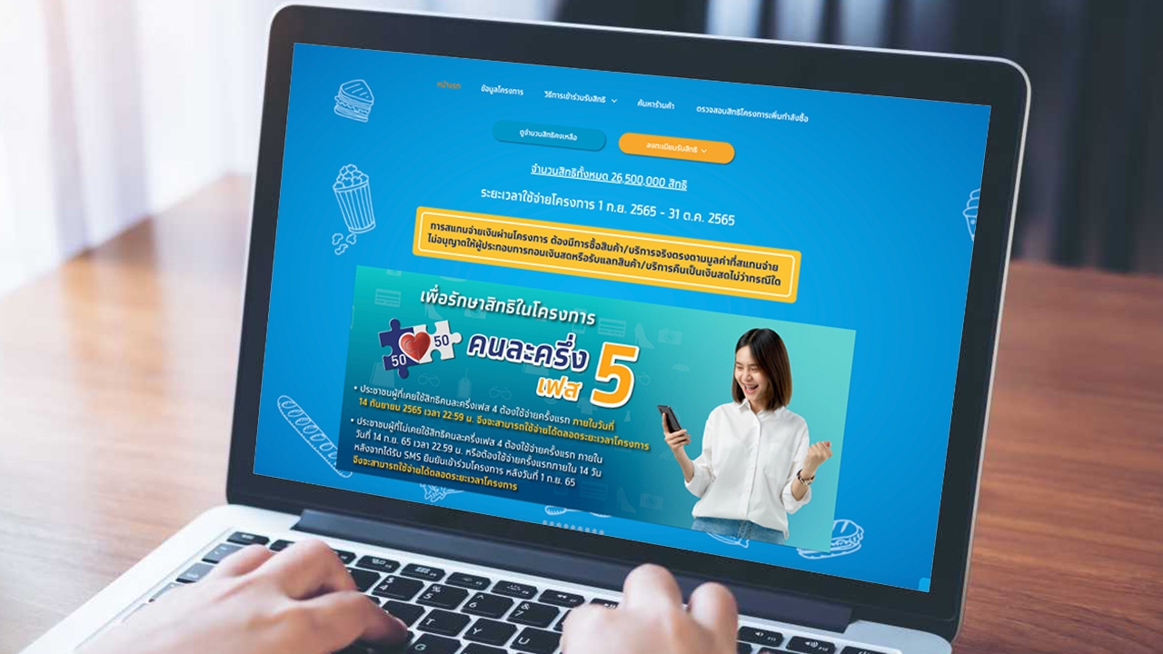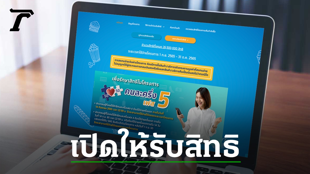 www.คนละครึ่ง.com เปิดให้ประชาชนลงทะเบียน "คนละครึ่งเฟส 5" รับสิทธิ์ร่วมจ่าย 800 บาท ตั้งแต่ 6 โมงเช้าวันที่ 19 ส.ค. 2565 ส่วนคนที่เคยใช้สิทธิ์แล้ว อย่าลืมกดเข้าร่วมผ่านแอปพลิเคชัน "เป๋าตัง"