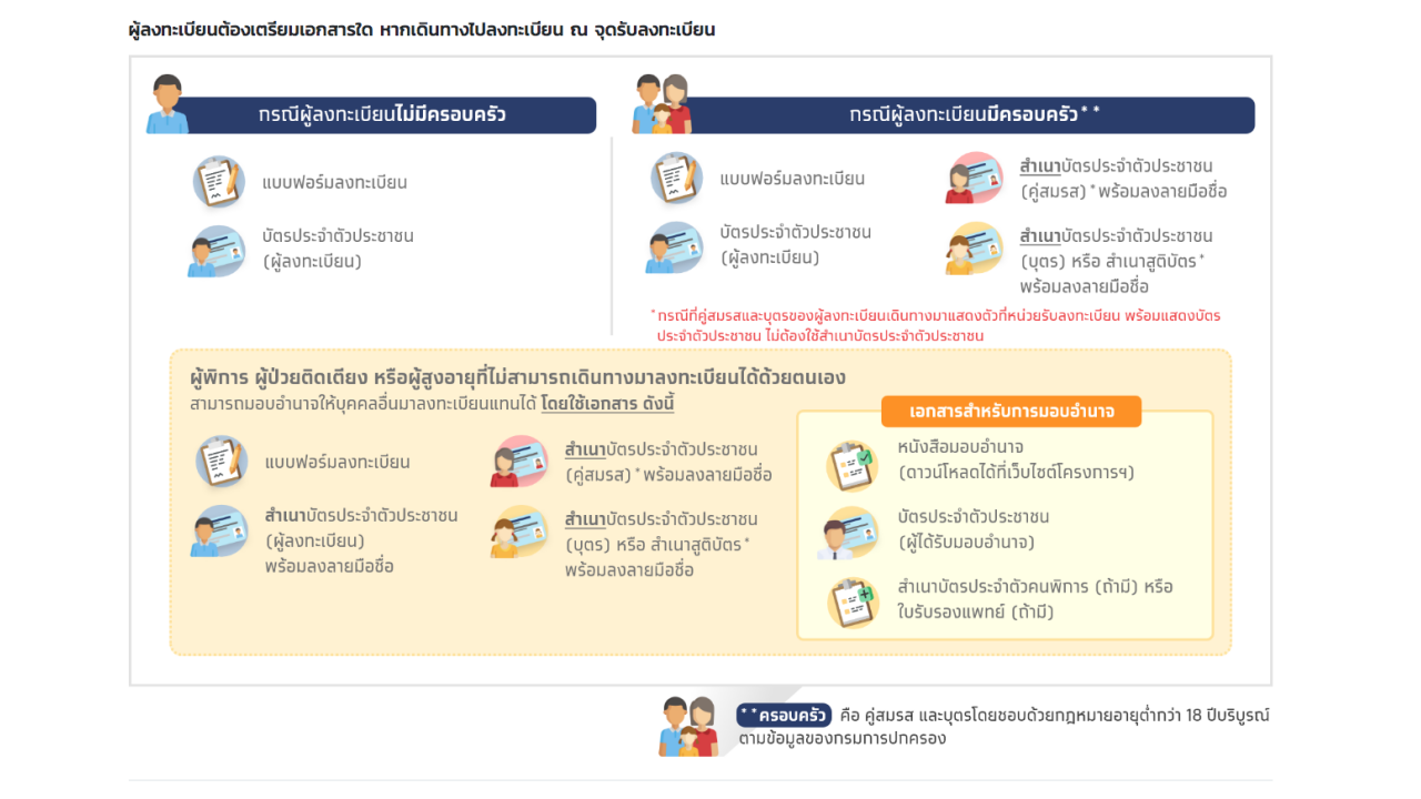 แบบฟอร์มลงทะเบียนจะต้องมีการลงนามที่ครบถ้วนหากมีครอบครัว (คู่สมรสและ/หรือบุตรที่อายุต่ำกว่า 18 ปี จะต้องลงนามทุกคนให้ครบถ้วน ทั้งนี้ คู่สมรสและ/หรือบุตรที่อายุต่ำกว่า 18 ปี ไม่จำเป็นต้องเดินทางมายื่นแบบฟอร์มลงทะเบียนพร้อมกับผู้ลงทะเบียน แต่จำเป็นต้องแนบสำเนาบัตรประจำตัวประชาชนของคู่สมรสและ/หรือบุตร พร้อมลงนามรับรองสำเนาถูกต้องมาพร้อมกับแบบฟอร์มลงทะเบียน