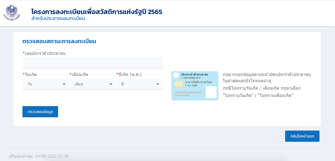 ตรวจสอบสถานะ "บัตรสวัสดิการแห่งรัฐ" 2565 เริ่มวันแรก 16 ก.ย. พร้อมย้ำผู้ลงทะเบียนที่มี "สถานะการลงทะเบียนไม่สมบูรณ์" สามารถตรวจสอบความถูกต้องได้ ณ ที่ว่าการอำเภอ/สำนักงานเขต