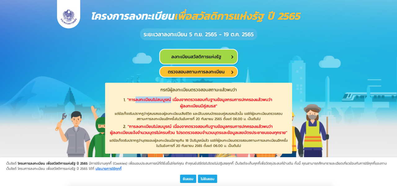 2. หากสถานะเป็น "สถานการณ์ลงทะเบียนไม่สมบูรณ์" เนื่องจากกรณีอื่นๆ ผู้ลงทะเบียนสามารถขอตรวจสอบความถูกต้องของข้อมูลได้ณ ที่ว่าการอำเภอ/สำนักงานเขต หากพบว่าข้อมูลไม่ถูกต้องขอให้ดำเนินการปรับปรุงแก้ไขให้ถูกต้อง หรือหากพบว่าข้อมูลที่ลงทะเบียนไม่ตรงกับข้อมูลทะเบียนราษฎร เช่นจำนวนบุตรที่อายุต่ำกว่า 18 ปี มีจำนวนมากกว่าข้อมูลบุตรที่ลงทะเบียนไว้ เป็นต้น กรณีดังกล่าวหากเป็นผู้ที่ลงทะเบียนที่หน่วยงานรับลงทะเบียนจะต้องติดต่อขอแก้ไขข้อมูล ณ หน่วยงานรับลงทะเบียนที่ผู้ลงทะเบียนได้ยื่นแบบฟอร์มลงทะเบียนไว้เท่านั้นและสำหรับผู้ที่ลงทะเบียนด้วยตนเองผ่านเว็บไซต์สามารถติดต่อขอแก้ไขข้อมูลที่หน่วยงานรับลงทะเบียนใดก็ได้ โดยจะต้องแก้ไขให้แล้วเสร็จภายในวันพฤหัสบดีที่ 3 พ.ย. 2565