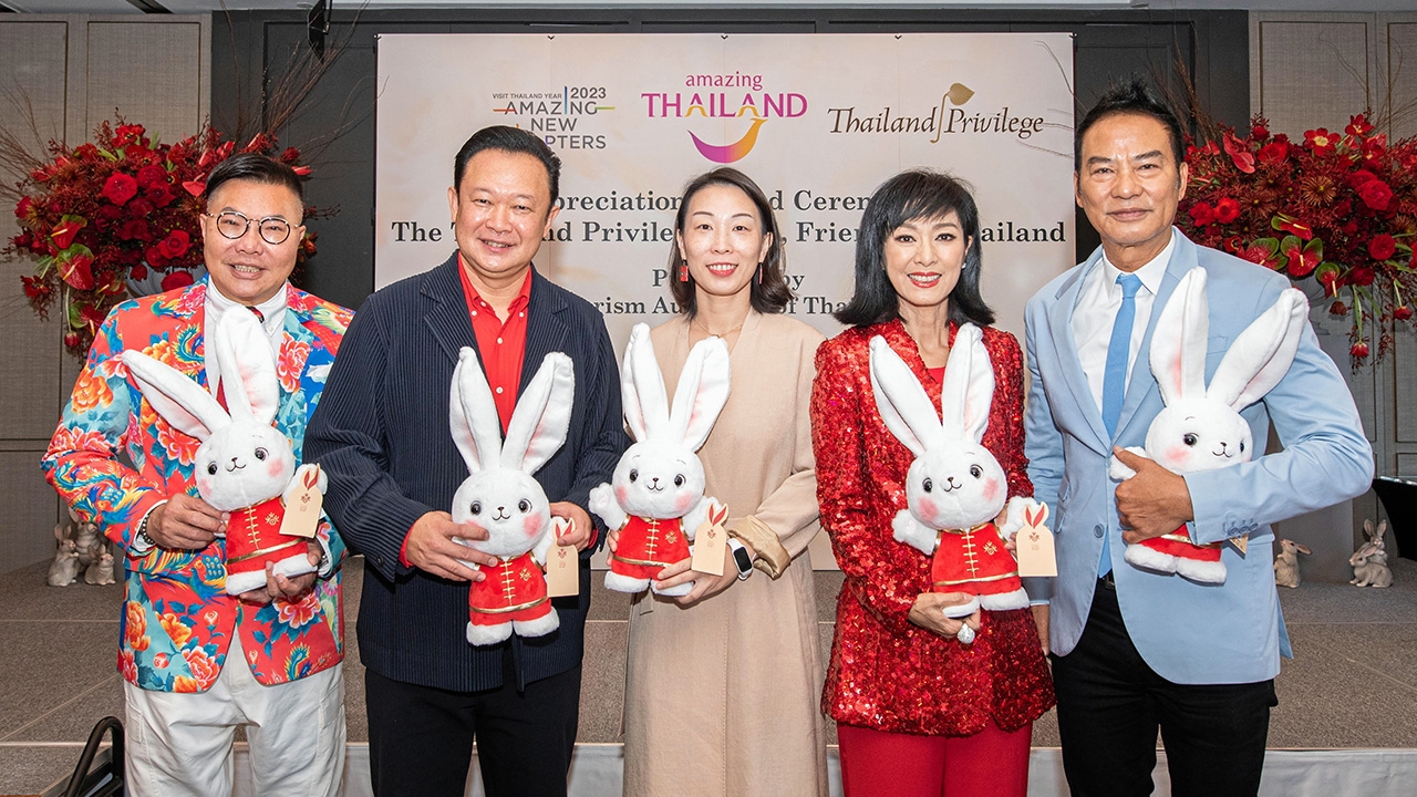 นายยุทธศักดิ์ สุภสร ผู้ว่าการ ททท. ร่วมถ่ายภาพกับ 3 คนดัง โรเจอร์ วู (ซ้ายสุด) หมีเซียะ (ชุดแดง) และเยิ่นต๊ะหัว (ขวาสุด) หลังมอบเกียรติบัตร ไทยแลนด์พรีวิเลจการ์ด ในฐานะทำคุณประโยชน์ต่อการท่องเที่ยวไทย.