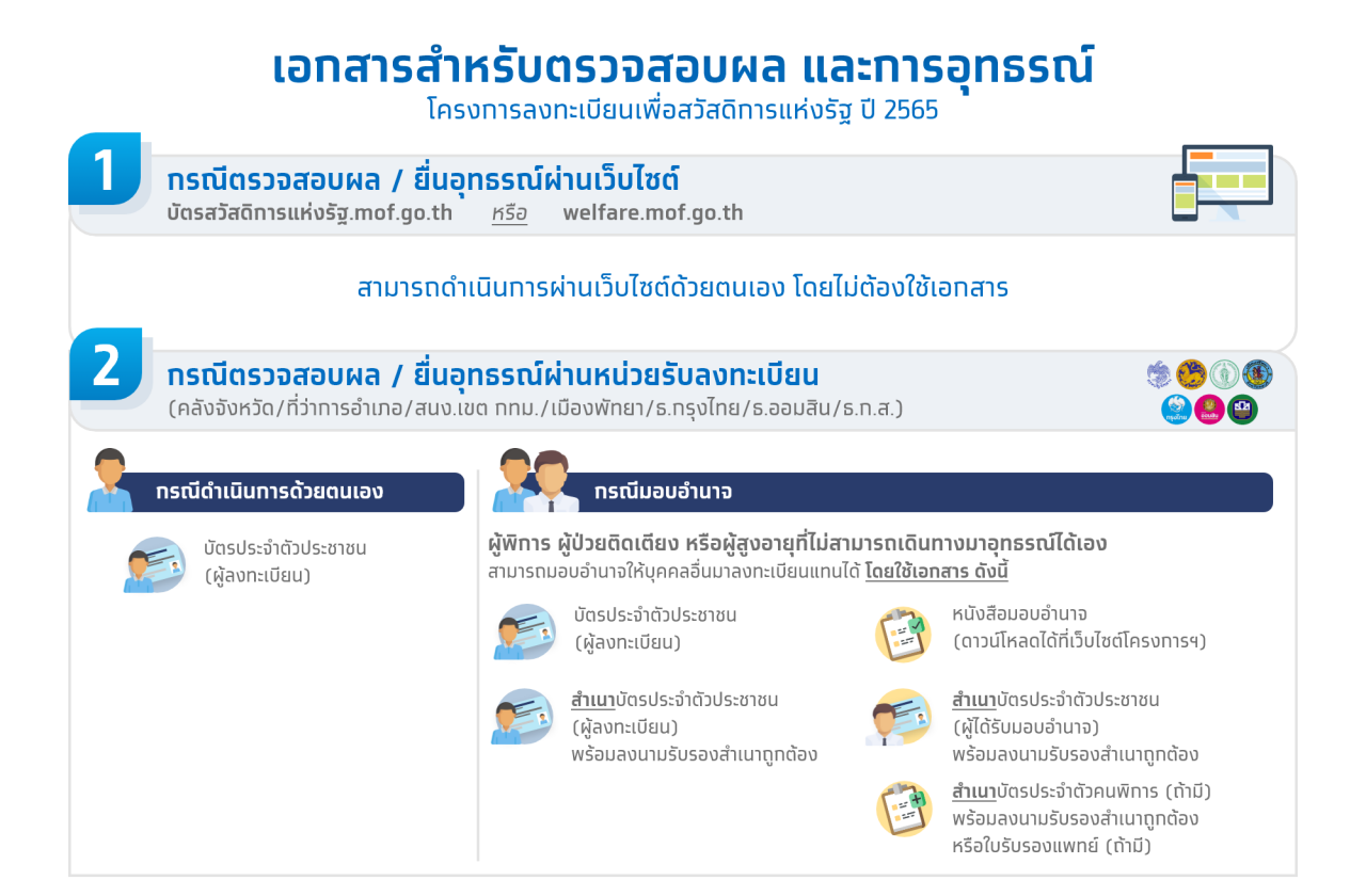 เมื่อตรวจสอบรายชื่อแล้วพบว่า เป็นผู้มีสิทธิรับสวัสดิการแห่งรัฐ จะต้องเดินทางไปยืนยันตัวตนด้วยตัวเองที่ 3 ธนาคารเท่านั้น คือ ธ.ก.ส., ออมสิน, กรุงไทย ต้องนำบัตรประจำตัวประชาชนติดตัวไปด้วย เนื่องจากสิทธิสวัสดิการแห่งรัฐจากนี้ไปจะใช้บัตรประจำตัวประชาชนเท่านั้น โดยจะเชื่อมข้อมูลไปยังบัญชีธนาคารใดก็ได้ที่ผูกกับระบบพร้อมเพย์ เพื่อโอนเงินให้ทุกเดือน