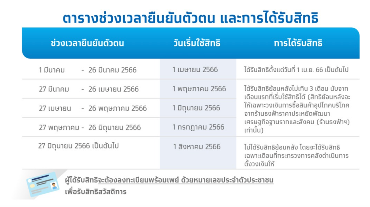 ส่วนผู้ผ่านเกณฑ์ที่ไม่ได้ดำเนินการยืนยันตัวตนภายในวันที่ 26 มี.ค. 2566 ยังคงสามารถยืนยันตัวตนได้ที่ธนาคารทั้งสามแห่งข้างต้นได้ตามวันเวลาที่หน่วยงานกำหนด แต่จะสามารถเริ่มใช้สิทธิสวัสดิการแห่งรัฐได้ตามวันที่กระทรวงการคลังกำหนด โดยรายละเอียดช่วงเวลาการยืนยันตัวตนและวันที่เริ่มใช้สิทธิ ดังนี้