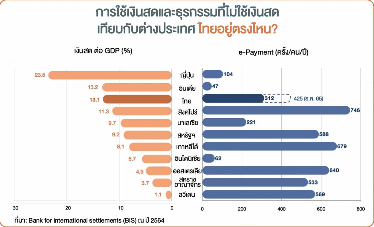 ข้อมูลจาก Bank for international settlements (BIS) เผยถึง ข้อมูลการใช้เงินสดและธุรกรรมที่ไม่ใช้เงินสด (e-Payment) ของแต่ละประเทศ พบว่า เมื่อปี 2564 ประเทศไทยเรามีการใช้เงินสดต่อ GDP มากถึง 13.1% เป็นรองเพียง ญี่ปุ่น (23.5%) และอินเดีย (13.2) ขณะที่ประเทศใกล้บ้านเราอย่าง สิงคโปร์ สัดส่วนอยู่ที่ 11.3% ต่อ GDP และมาเลเซีย อยู่ที่ 9.7% ต่อ GDP