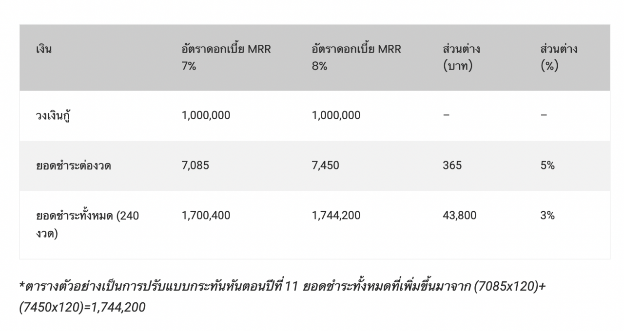 แต่เมื่อดอกเบี้ย MRR ในปีที่ 4 เป็นต้นไป เพิ่มเป็น 8% หากยังผ่อนชำระภายใน 20 ปี เงินงวดผ่อนชำระจะเพิ่มเป็น 7,460 บาทต่องวด หรือเพิ่มขึ้นงวดละ 375 บาท หรือคิดเป็นมูลค่าเงินต้นรวมดอกเบี้ยต้องผ่อนชำระมากขึ้นทั้งหมด 90,000 บาทต่อเงินกู้จำนวน 1 ล้านบาท หรือถ้ายังต้องการชำระค่างวดเท่าเดิมที่ 7,085 บาท ต้องขยายเวลาการผ่อนเป็น 271 งวด หรือ 22-23 ปี