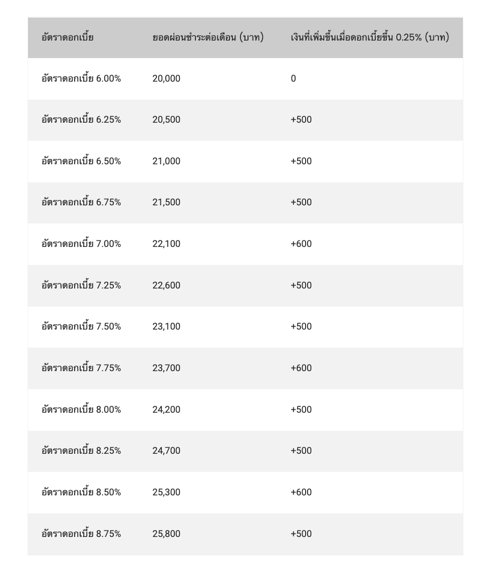 ภายใต้ ความจริงที่ต้องรู้ ว่า ดอกเบี้ยนโยบายทุกๆ 1% ที่ปรับขึ้นจะทำให้ภาระการผ่อนสินเชื่อบ้านทั้งหมดปรับขึ้นอีกประมาณ 7% ส่งผลให้ผู้ซื้อบ้านต้องส่งเงินงวดสูงขึ้นกว่าเดิมหรือใช้เวลามากขึ้นในการผ่อนชำระ