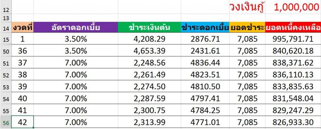 สมมติให้เงินกู้เป็นจำนวน 1 ล้านบาท ดอกเบี้ย 3 ปีแรกคงที่ที่ 3.5% ขณะที่ปีที่ 4 ดอกเบี้ย=MRR หาก MRR เดิมอยู่ที่ 7% และกำหนดผ่อนชำระ 20 ปี (240 งวด) จะเท่ากับต้องผ่อนชำระ 7,085 บาทต่องวด