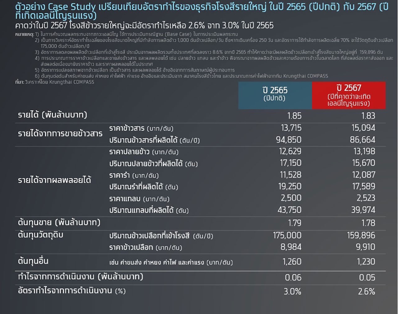 ปรากฏการณ์เอลนีโญในรอบนี้ คาดว่าจะส่งผลกระทบต่อภาคเกษตรในช่วงปลายปี 2566 และทวีความรุนแรงในช่วงครึ่งปีแรกของปี 2567 ซึ่งจะทำให้ผลผลิตเกษตรเสียหายราว 5.3 หมื่นล้านบาท โดยข้าวจะได้รับความเสียหายมากที่สุดราว 2.8 หมื่นล้านบาท ซึ่งส่งกระทบต่ออัตรากำไรของโรงสีข้าว เช่น โรงสีรายใหญ่จะมีอัตรากำไรลดลงเหลือ 2.6% ในปี 2567 จาก 3.0% ในปี 2565