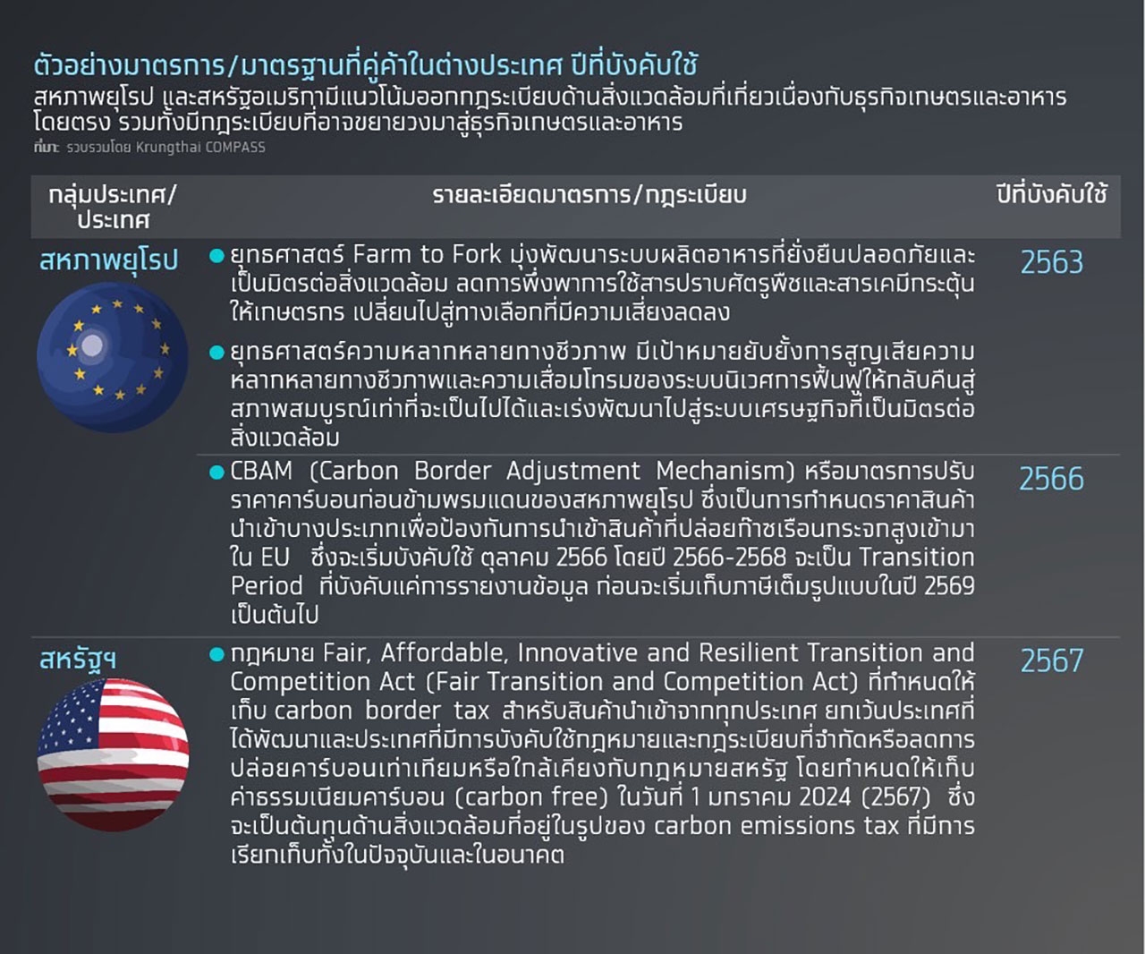 กฎระเบียบของคู่ค้าด้านสิ่งแวดล้อมในตลาดส่งออกที่เข้มงวดขึ้น จะเป็นอุปสรรคต่อการส่งออกสินค้าของไทยไปยังประเทศคู่ค้า โดยเฉพาะ EU และ US ที่ให้ความสำคัญกับประเด็นมาตรฐานด้านสิ่งแวดล้อมอย่างเข้มข้น เช่น นโยบาย Farm to Fork ของสหภาพยุโรป ซึ่งเป็นส่วนหนึ่งของข้อตกลงยุโรปสีเขียว (European Green Deal) ที่ให้ความสำคัญกับการตรวจสอบย้อนกลับตั้งแต่กระบวนการผลิตไปจนถึงผู้บริโภค โดยตั้งเป้าว่าจะลดคาร์บอนไดออกไซด์ให้ได้อย่างน้อย 55% ภายในปี 2030 นอกจากนั้น ยังมีมาตรการที่ในอนาคตมีโอกาสขยายวงมาสู่ธุรกิจเกษตรและอาหารได้ เช่น มาตรการปรับคาร์บอนข้ามพรมแดน (CBAM) ของ EU ที่คาดว่าจะมีผลบังคับใช้ในปี 2566