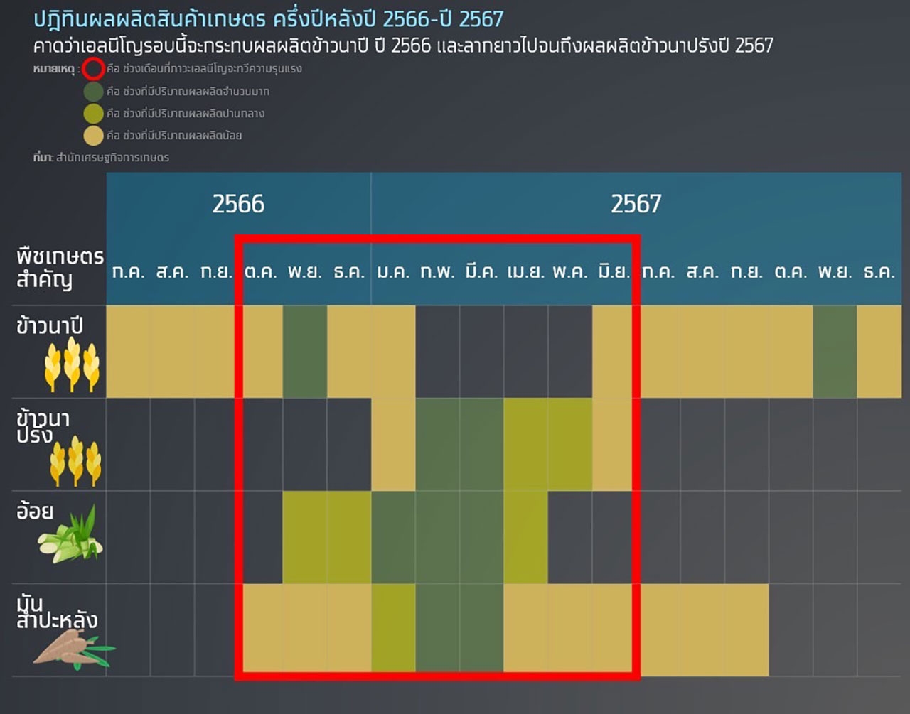 ปรากฏการณ์เอลนีโญที่เริ่มก่อตัวขึ้นตั้งแต่ช่วงครึ่งปีหลังของปี 2566 และจะทวีความรุนแรงในช่วงครึ่งปีแรกของปี 2567 จะส่งผลกระทบต่อปริมาณน้ำต้นทุนที่ใช้ในการเพาะปลูก โดย ณ 19 ก.ค. 2566 ปริมาณน้ำในเขื่อนใช้การได้ โดยรวมทั้งประเทศอยู่ในระดับต่ำ โดยเฉพาะภาคกลาง และภาคตะวันตก ซึ่งอยู่ในระดับใกล้เคียงกับปี 2558 ที่เกิดภัยแล้งรุนแรง สถานการณ์ดังกล่าวจะสร้างความเสี่ยงต่อผลผลิตสินค้าเกษตรสำคัญอย่าง ข้าวนาปี ที่จะมีผลผลิตออกสู่ตลาดมากในช่วงปลายปี 2566 รวมทั้งข้าวนาปรัง อ้อย และมันสำปะหลัง ที่จะมีผลผลิตออกสู่ตลาดมากในช่วงครึ่งปีแรกของปี 2567 อย่างหลีกเลี่ยงไม่ได้ โดยคาดว่าข้าว จะได้รับความเสียหายเป็นหลัก เนื่องจากภาคกลางซึ่งเป็นพื้นที่เสี่ยงภัยแล้งรุนแรงเป็นแหล่งเพาะปลูกข้าวที่สำคัญ โดยเฉพาะข้าวนาปรัง อีกทั้งเป็นพืชที่ทนแล้งได้น้อยกว่าอ้อย และมันสำปะหลัง