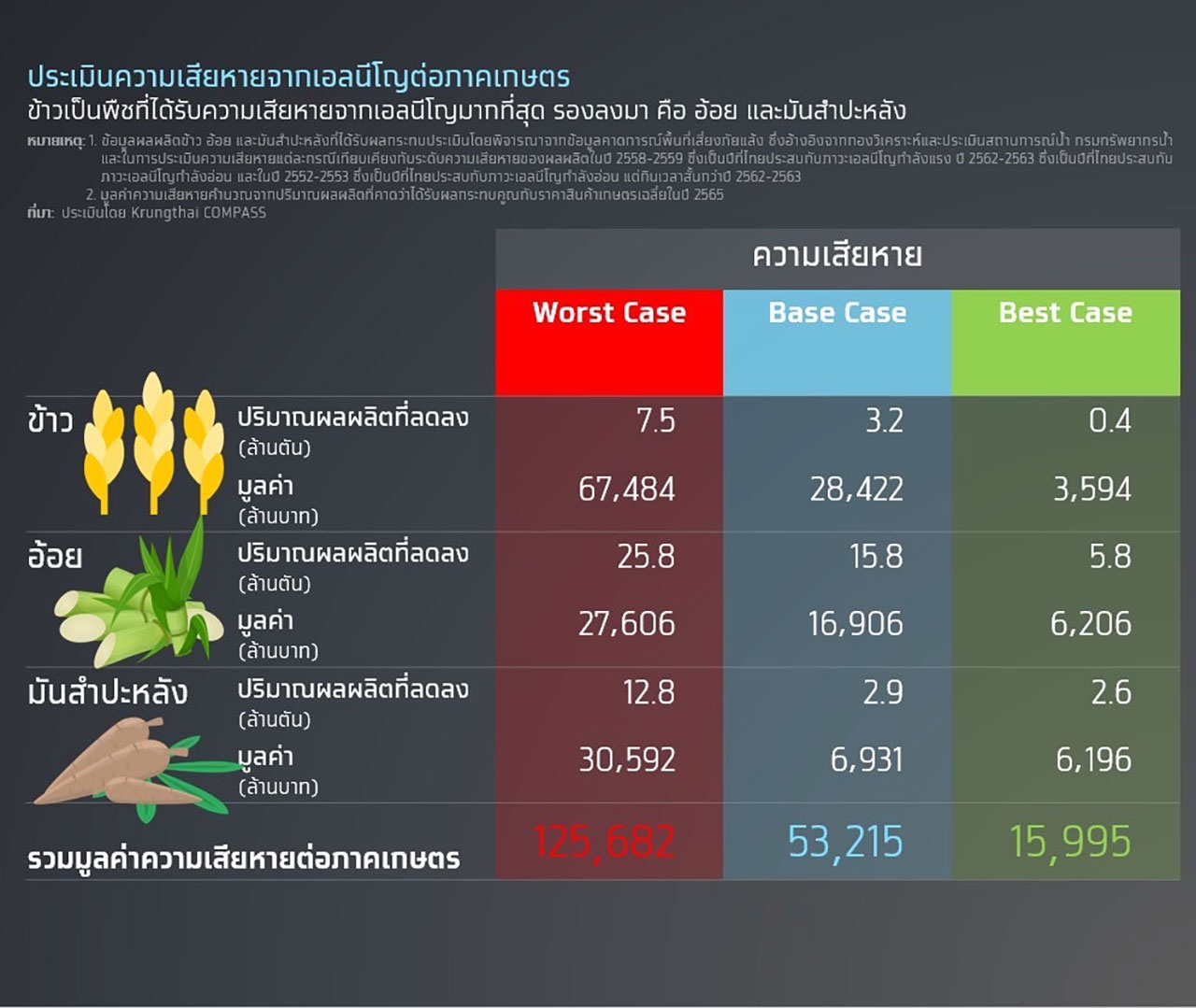 เอลนีโญในรอบนี้คาดว่าจะทำให้ 3 พืชในภาคเกษตรกรรมสำคัญ ได้แก่ ข้าว อ้อย และมันสำปะหลัง ได้รับความเสียหายรวมกันอยู่ที่ราว 16,000-126,000 ล้านบาท โดยขึ้นอยู่กับความรุนแรงของสถานการณ์เอลนีโญ ซึ่งมีสมมติฐานในแต่ละกรณีดังนี้