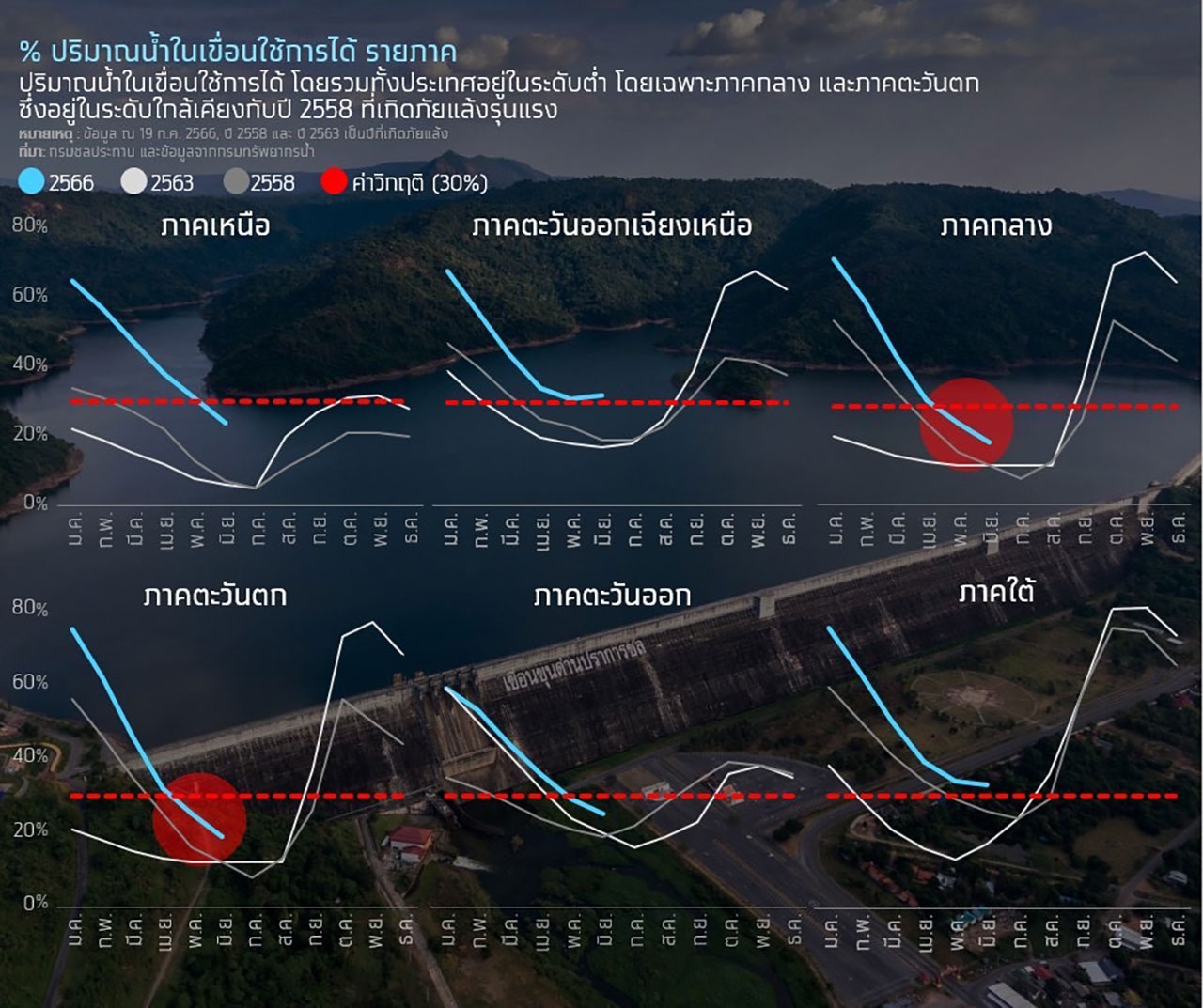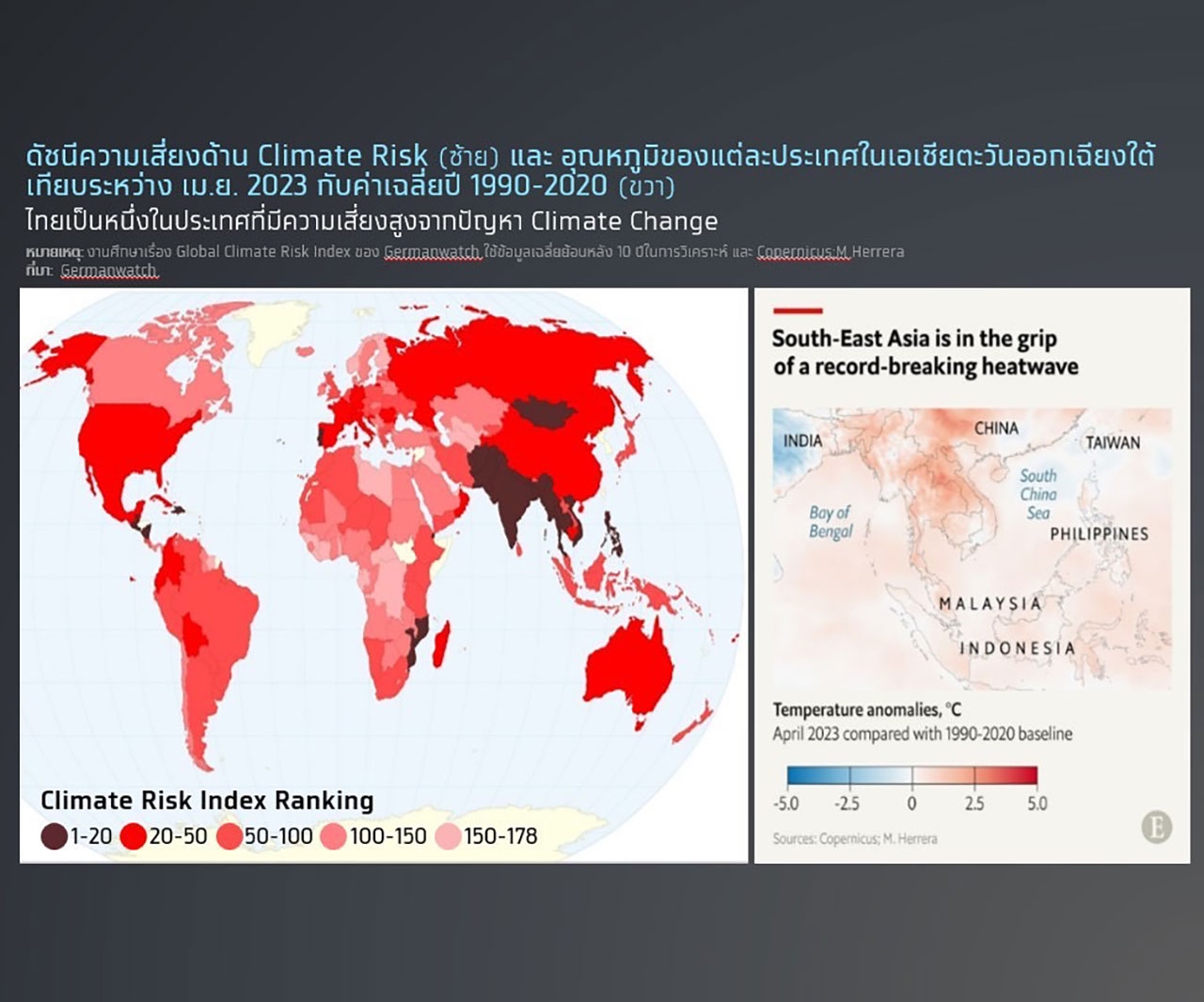ไทยมีความเสี่ยงสูงจากปัญหา Climate Change และความเสี่ยงดังกล่าวเริ่มส่งผลกระทบต่อไทยชัดเจนมากขึ้น โดยจากข้อมูลจาก Global Climate Risk 2021 ชี้ว่า ไทยถูกจัดอันดับเป็นประเทศที่มีความเสี่ยงต่อการเปลี่ยนแปลงสภาพภูมิอากาศในอันดับที่ 9 จาก 180 ประเทศทั่วโลก จึงมีโอกาสสูงที่จะเผชิญกับปัญหาสภาพอากาศที่สูงขึ้นกว่าปกติและสภาพอากาศสุดขั้ว (รูปซ้าย) ขณะที่ล่าสุดในปี 2566 ไทยเจอกับปัญหากับสภาพอากาศที่ร้อนกว่าปกติ เช่นเดียวกับหลายประเทศในเอเชีย เห็นได้จากในช่วงเดือนเมษายน 2566 มีรายงานว่าที่ จ.ตาก มีอุณหภูมิสูงถึง 45.4 องศาเซลเซียส สอดคล้องกับข้อมูลอุณหภูมิของแต่ละประเทศในเอเชียตะวันออกเฉียงใต้ในเดือนเมษายน ปี 2023 ก็สูงขึ้นกว่าค่าเฉลี่ยในอดีตปี 1990-2020 (รูปขวา) ซึ่งปัจจัยที่กล่าวมาข้างต้น ส่งผลให้ปริมาณน้ำฝนลดน้อยลง ทำให้ไทยต้องเผชิญความเสี่ยงกับปัญหาขาดแคลนน้ำที่อาจทวีความรุนแรงมากขึ้นในอนาคต
