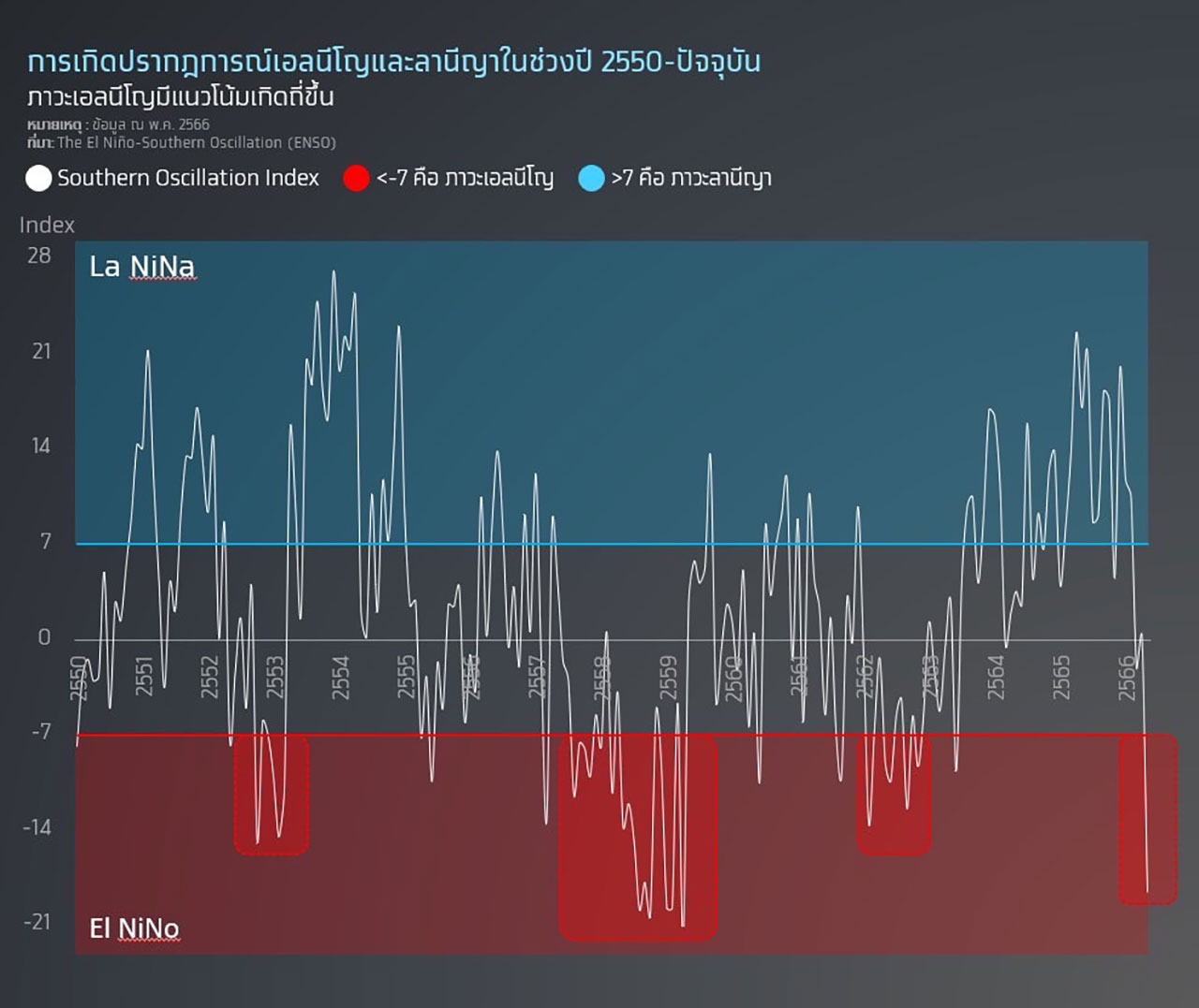 ปัญหา Climate Risk ที่ทวีความรุนแรงขึ้นทั่วโลก ได้สร้างความเสียหายให้กับผลผลิตภาคเกษตรทั่วโลกอยู่ที่ราวปีละ 21,400 ล้านเหรียญสหรัฐ (ราว 71.6 หมื่นล้านบาท) และคาดว่าในปี 2030 ความเสียหายในภาคเกษตรจะเพิ่มขึ้นไปอยู่ที่ปีละ 150,000 ล้านเหรียญสหรัฐ (ราว 502.5 หมื่นล้านบาท) ¹ขณะที่ไทยเป็นประเทศผู้ผลิตสินค้าเกษตรและอาหารที่สำคัญของโลก ทำให้ปัจจัย Climate Risk มีแนวโน้มที่จะส่งผลกระทบต่อภาคเศรษฐกิจไทยอย่างหลีกเลี่ยงไม่ได้ ดังนั้น คำถามที่น่าสนใจคือ ผลกระทบจาก Climate Risk จากปรากฎการณ์เอลนีโญที่เกิดขึ้นรอบล่าสุดนี้จะสร้างความเสียหายต่อภาคเกษตรแค่ไหน? ในระยะข้างหน้าภาคเกษตรจะเผชิญความเสี่ยงจากปัจจัยด้านสภาพภูมิอากาศ (Climate Risk) ในมิติใดบ้าง? และผู้ประกอบการที่เกี่ยวข้องจะรับมือกับความเสี่ยงนี้อย่างไร? แต่ก่อนที่จะตอบคำถามเหล่านี้ อยากชวนผู้อ่านมาสำรวจข้อมูลสถานการณ์ Climate Risk ในไทยก่อนว่าน่ากังวลหรือยัง?