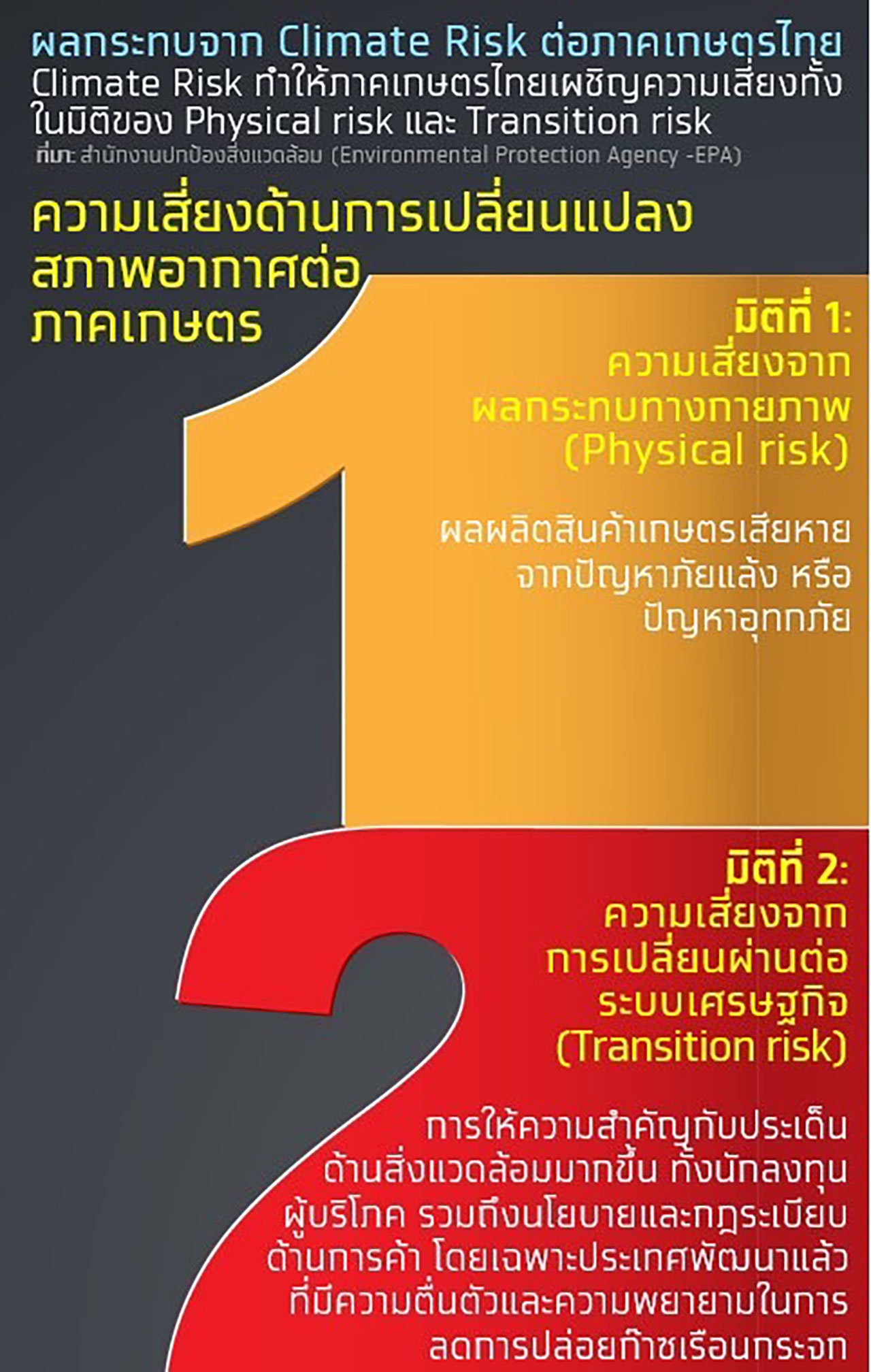 Climate Risk มีแนวโน้มจะสร้างความเสี่ยงต่อภาคเกษตรไทยใน 2 มิติหลัก คือ 1) ความเสี่ยงจากผลกระทบทางกายภาพ (Physical risk) 2) ความเสี่ยงจากการเปลี่ยนผ่านต่อระบบเศรษฐกิจ (Transition risk) โดยหากอ้างอิงจากบทความของ สำนักงานปกป้องสิ่งแวดล้อม (Environmental Protection Agency: EPA) ที่นำเสนอข้อมูลเกี่ยวกับ Climate Risks and Opportunities Defined² พบว่าผลกระทบจากปัญหา Climate Change จะก่อให้เกิดความเสี่ยงใน 2 มิติ คือ 1) ความเสี่ยงด้าน Physical risk เช่น การเกิดภัยแล้งที่สร้างความเสียหายต่อผลผลิตทางการเกษตร และ 2) ความเสี่ยงด้าน Transition risk เช่น ความเสี่ยงต่อความสามารถในการแข่งขันของภาคเกษตรไทยในตลาดส่งออก จากการเปลี่ยนแปลงของกฎเกณฑ์และนโยบายด้านสิ่งแวดล้อมของคู่ค้า รวมทั้งพัฒนาการของเทคโนโลยีด้านสิ่งแวดล้อม และการเปลี่ยนแปลงของพฤติกรรมผู้บริโภค
