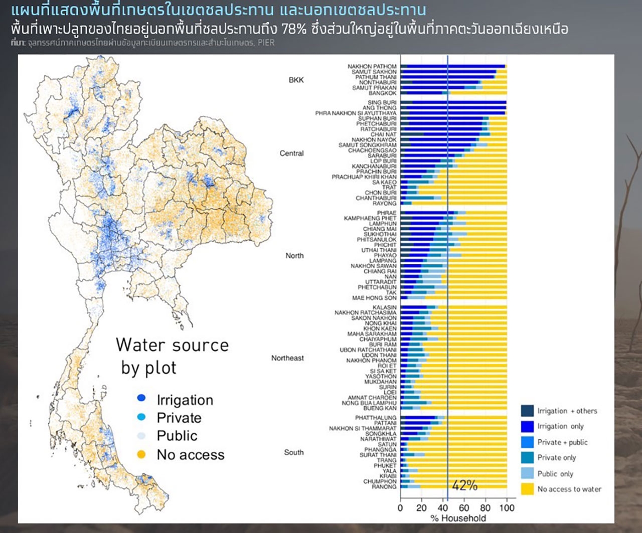 ● ควรให้ความสำคัญกับการลงทุนบริการจัดการน้ำ โดยเฉพาะการลงทุนเพิ่มแหล่งกักเก็บน้ำในพื้นที่นอกชลประทาน ซึ่งมักเป็นพื้นที่ที่ได้รับผลกระทบจากปัญหาภัยแล้งค่อนข้างมาก โดยผ่านมาการลงทุนในการบริหารจัดการน้ำในภาคเกษตรของไทยยังค่อนข้างน้อย อยู่ที่เพียง 0.4% ของ GDP เทียบกับเป้าหมายการพัฒนาที่ยั่งยืนขององค์การสหประชาชาติ ซึ่งควรอยู่ที่ 1-2% ของ GDP ⁶นอกจากนี้ เม็ดเงินลงทุนในการบริหารจัดการน้ำส่วนใหญ่ของไทยกระจุกตัวอยู่ในพื้นที่เขตชลประทานเป็นหลัก ส่วนพื้นที่นอกชลประทานยังลงทุนค่อนข้างน้อย