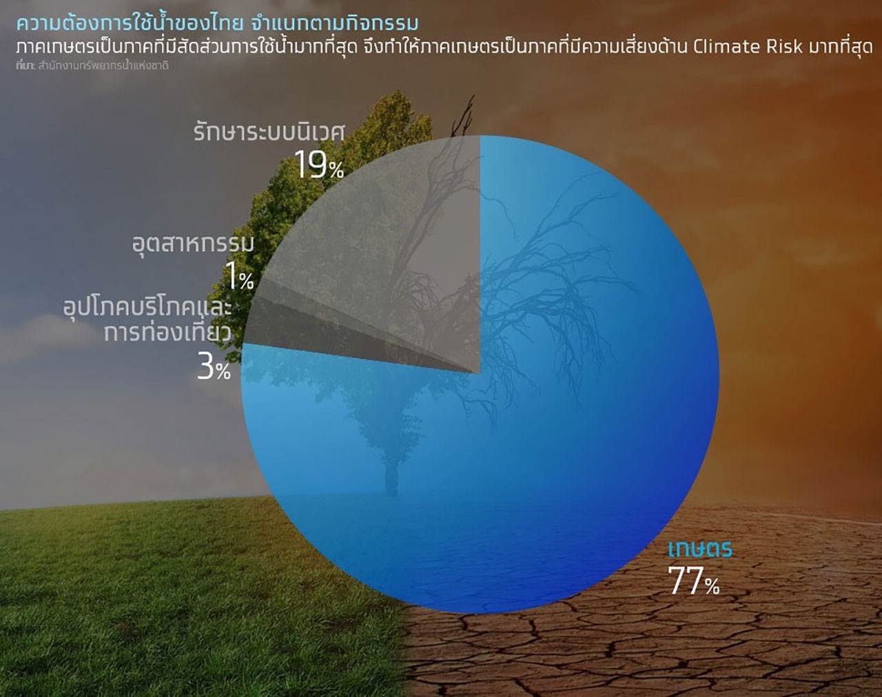 ภาคเกษตรเป็น Sector ที่มีแนวโน้มจะได้รับผลกระทบจากปัญหา Climate Risk ชัดเจนกว่า Sector อื่น เนื่องจากมีสัดส่วนการใช้น้ำมากที่สุด เมื่อเทียบกับ Sector อื่นๆ โดยภาคเกษตรใช้น้ำคิดเป็นสัดส่วนประมาณ 77% ของการใช้น้ำในแต่ละปีของไทย ทั้งนี้ ความต้องการใช้น้ำในแต่ละปีของไทยอยู่ที่ราว 147,747 ล้านลูกบาศก์เมตร (ลบ.ม.) แบ่งเป็น การใช้น้ำสำหรับภาคเกษตรที่ 113,961 ล้าน ลบ.ม. (สัดส่วน 77% ของการใช้น้ำทั้งหมด) รองลงไปคือ การใช้เพื่อระบบนิเวศ 27,090 ล้าน ลบ.ม. (19%) การใช้เพื่อการท่องเที่ยวและอุปโภคบริโภคที่ราว 4,783 ล้าน ลบ.ม. (3%) และใช้สำหรับภาคอุตสาหกรรมที่ราวปีละ 1,913 ล้าน ลบ.ม. (1%) โดยผู้เล่นในภาคเกษตรส่วนใหญ่เป็นเกษตรกรรายย่อย ทำให้มีข้อจำกัดในการปรับตัวด้านการบริหารจัดการน้ำ อีกทั้งพื้นที่เพาะปลูกของไทยอยู่นอกพื้นที่ชลประทานถึง 78% ซึ่งส่วนใหญ่อยู่ในพื้นที่ภาคตะวันออกเฉียงเหนือ จึงเป็นพื้นที่ที่มีความเสี่ยงจากปัญหาขาดแคลนน้ำในการทำเกษตรกรรมมากที่สุด