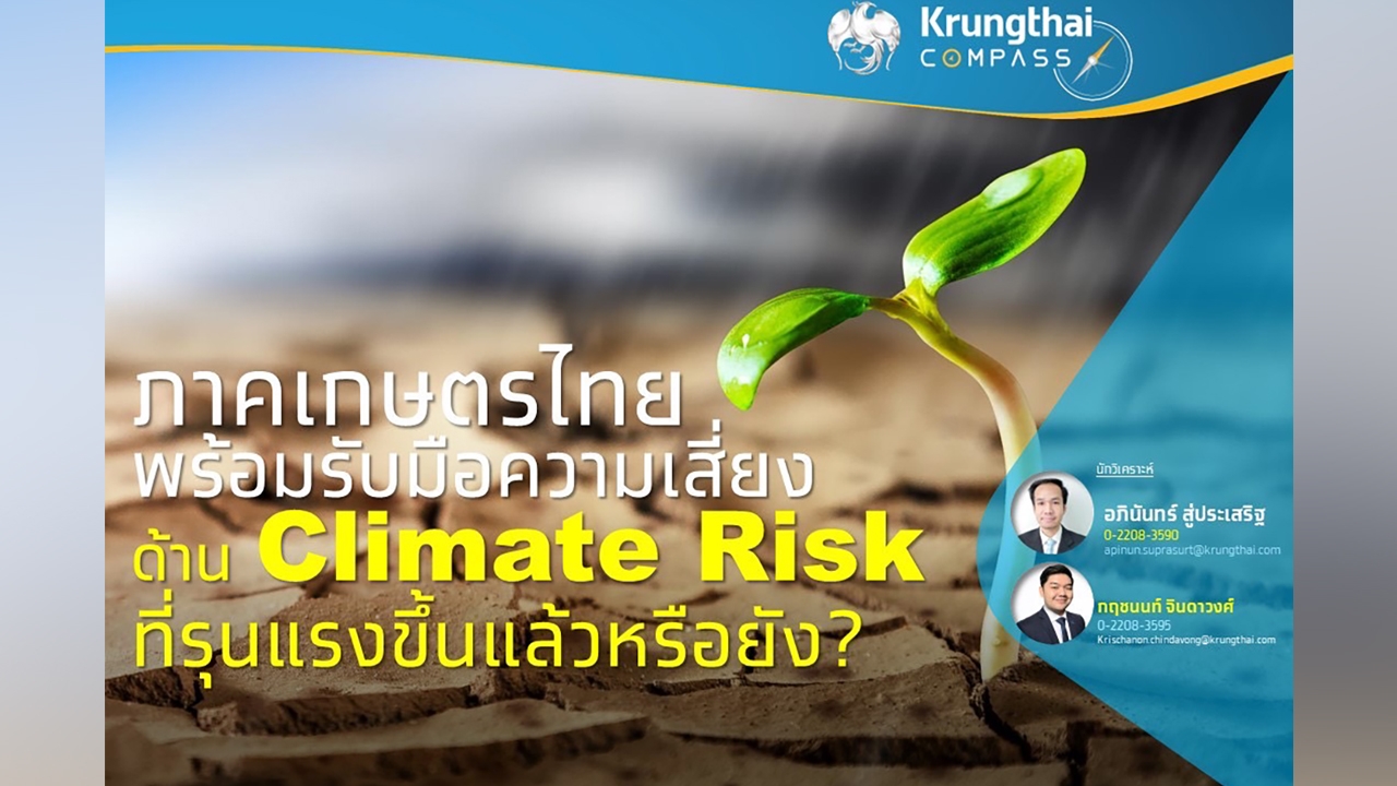 Krungthai COMPASS มองว่า ความเสี่ยงจากผลผลิตสินค้าเกษตรที่เสียหายจากปัญหาภัยธรรมชาติที่รุนแรงขึ้น และความเสี่ยงจากนโยบายและกฎระเบียบทางการค้าที่ให้ความสำคัญกับสิ่งแวดล้อมมากยิ่งขึ้น จะเป็นความเสี่ยงที่จะเห็นได้ชัดและส่งผลกระทบต่อผู้ประกอบการไทยชัดเจนขึ้นในระยะ 1-2 ปีนี้ ดังนั้น ในบทความส่วนถัดไปจะประเมินผลกระทบจากความเสี่ยงดังกล่าว เพื่อให้ทุกภาคส่วนได้เตรียมปรับตัวเพื่อลดผลกระทบ