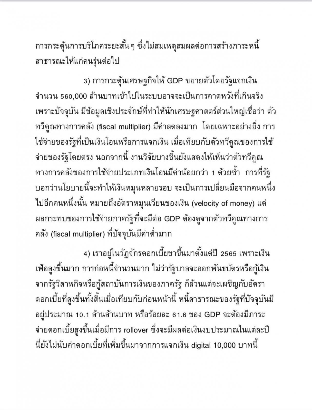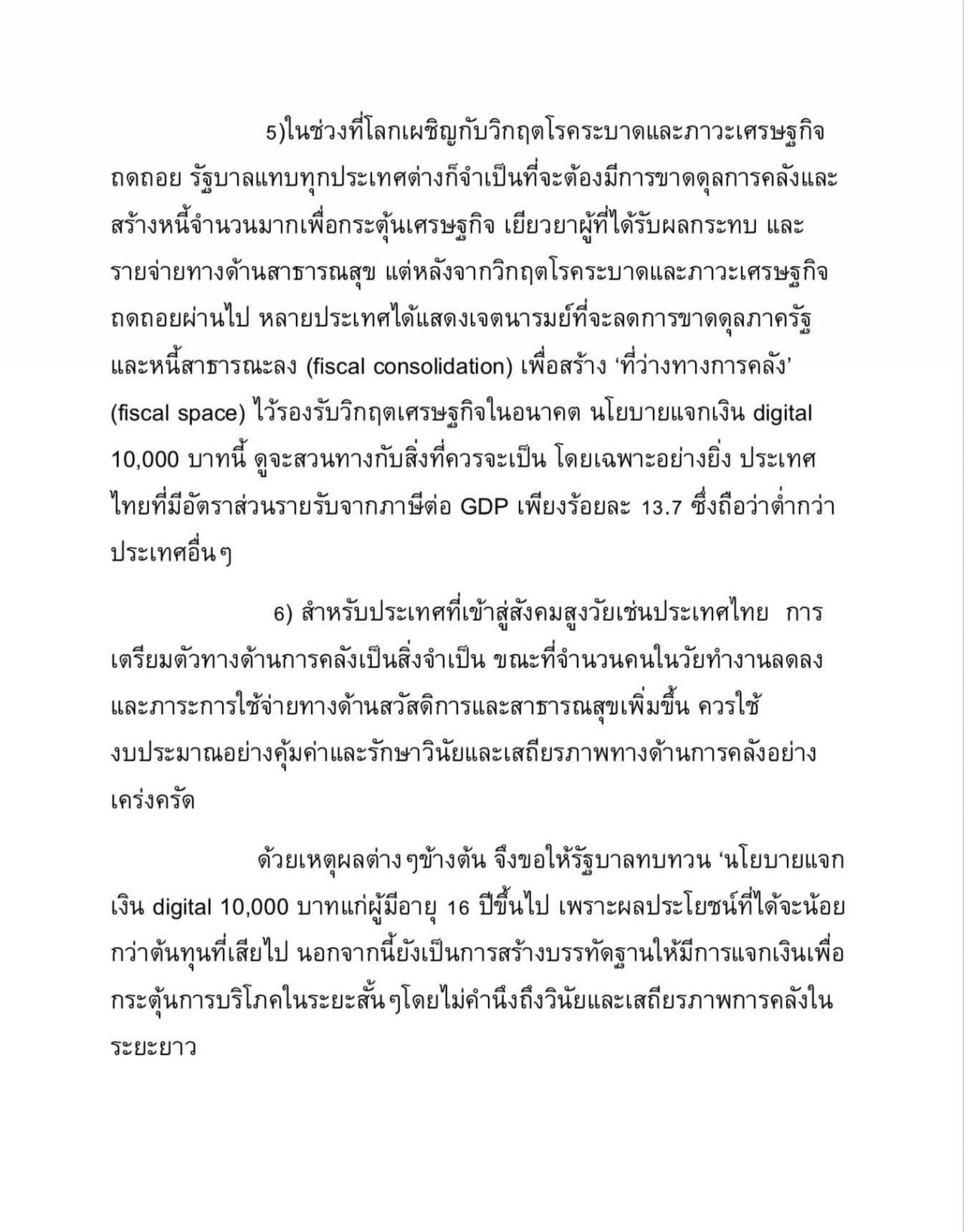 “ด้วยเหตุผลต่างๆ ข้างต้น จึงขอให้รัฐบาลทบทวน 'นโยบายแจกเงิน Digital 10,000 บาทแก่ผู้มีอายุ 16 ปีขึ้นไป เพราะผลประโยชน์ที่ได้จะน้อยกว่าต้นทุนที่เสียไป นอกจากนี้ยังเป็นการสร้างบรรทัดฐานให้มีการแจกเงินเพื่อกระตุ้นการบริโภคในระยะสั้นๆ โดยไม่คำนึงถึงวินัยและเสถียรภาพการคลังในระยะยาว”