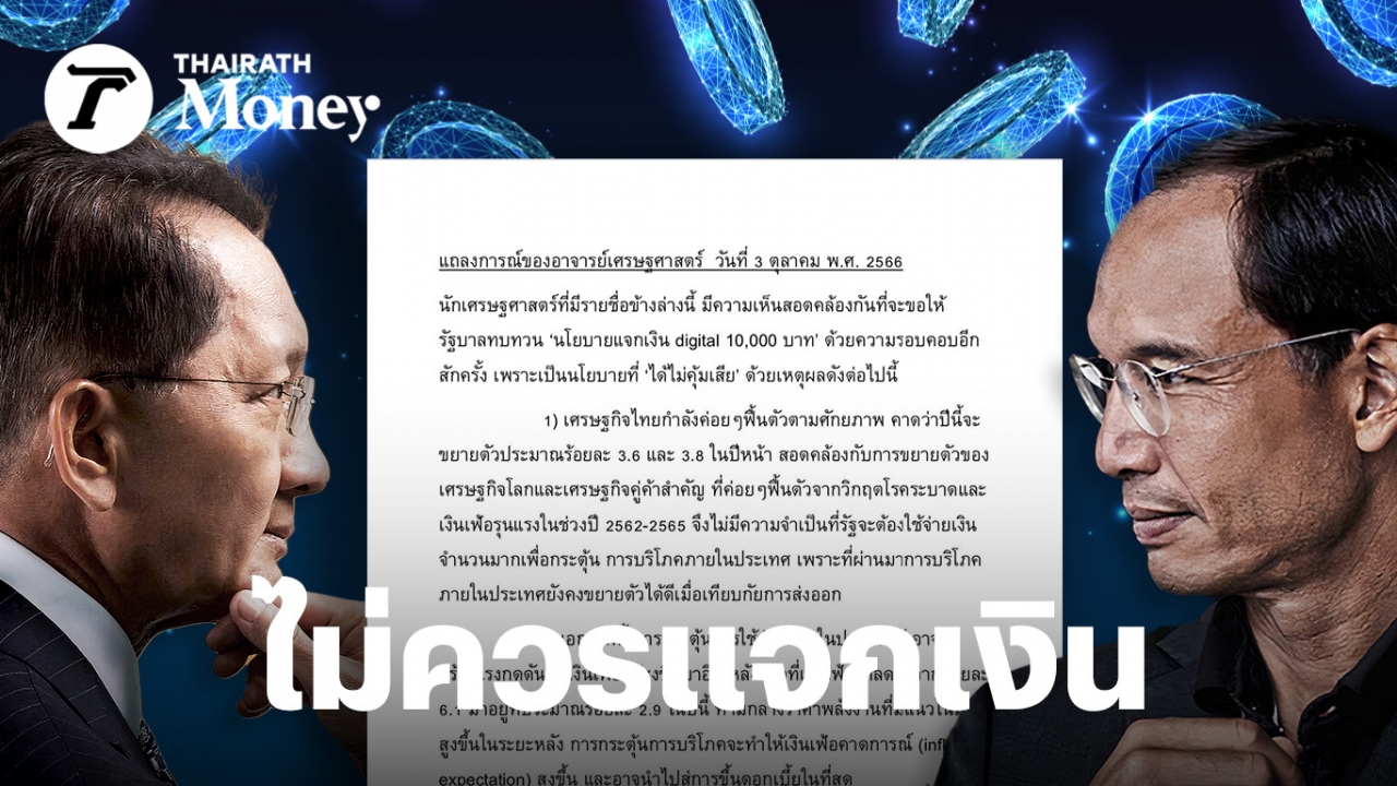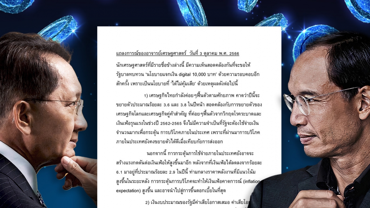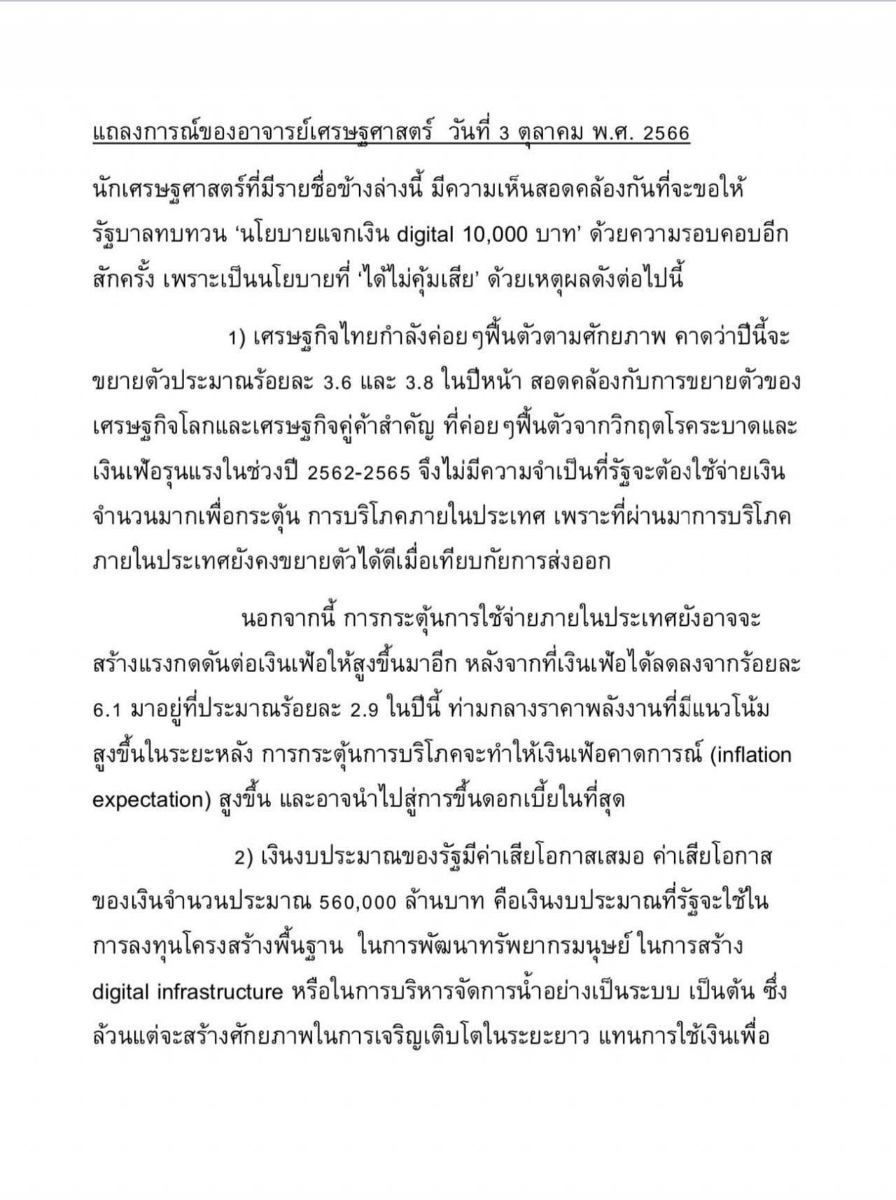 ล่าสุด ยังมีแถลงการณ์ ไม่ทราบที่มาชัดเจน แต่จั่วหัวว่า เป็นแถลงการณ์ร่วม ของอาจารย์เศรษฐศาสตร์ โดยมีรายชื่อแนบติดมาด้วย (แต่ไม่ปรากฏนาม) โดยรายละเอียดของเนื้อหานั้น มีใจความ ขอให้รัฐบาลทบทวน “นโยบายแจกเงิน Digital 10,000 บาท” ด้วยความรอบคอบอีก สักครั้ง เพราะ เป็นนโยบายที่อาจ “ได้ไม่คุ้มเสีย” จาก เหตุผล 6 ข้อ ดังนี้