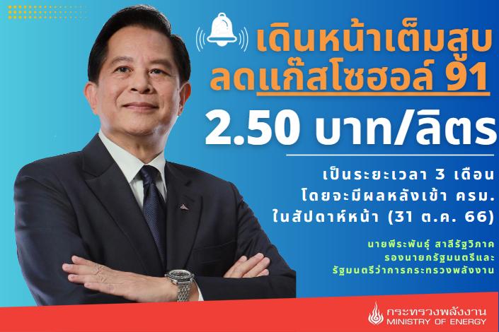 ล่าสุด พีระพันธุ์ สาลีรัฐวิภาค รัฐมนตรีว่าการกระทรวงพลังงาน เผยวานนี้ อีกว่า รัฐบาลจะเดินหน้าเต็มสูบ ลดราคาแก๊สโซฮอล์ 91 ซึ่งเป็นน้ำมันเบนซินที่มีราคาถูกที่สุด โดยจะขอปรับลดราคาลง 2.50 บาทต่อลิตร เป็นระยะ 3 เดือน ด้วยกัน โดยคาดจะมีผลหลังเข้า ครม. ในสัปดาห์หน้า (31 ต.ค.2566) โดยจะใช้แนวทางเดียวกับดีเซล
