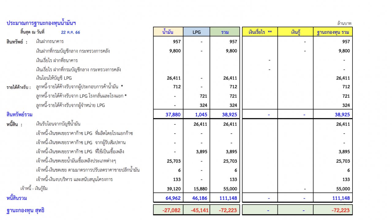 ขณะปัจจุบัน ณ วันที่ 22 ตุลาคม 2666 กองทุนน้ำมันเชื้อเพลิง มีฐานะติดลบเพิ่มมาอยู่ที่ -72,223 ล้านบาท โดยแบ่งเป็น