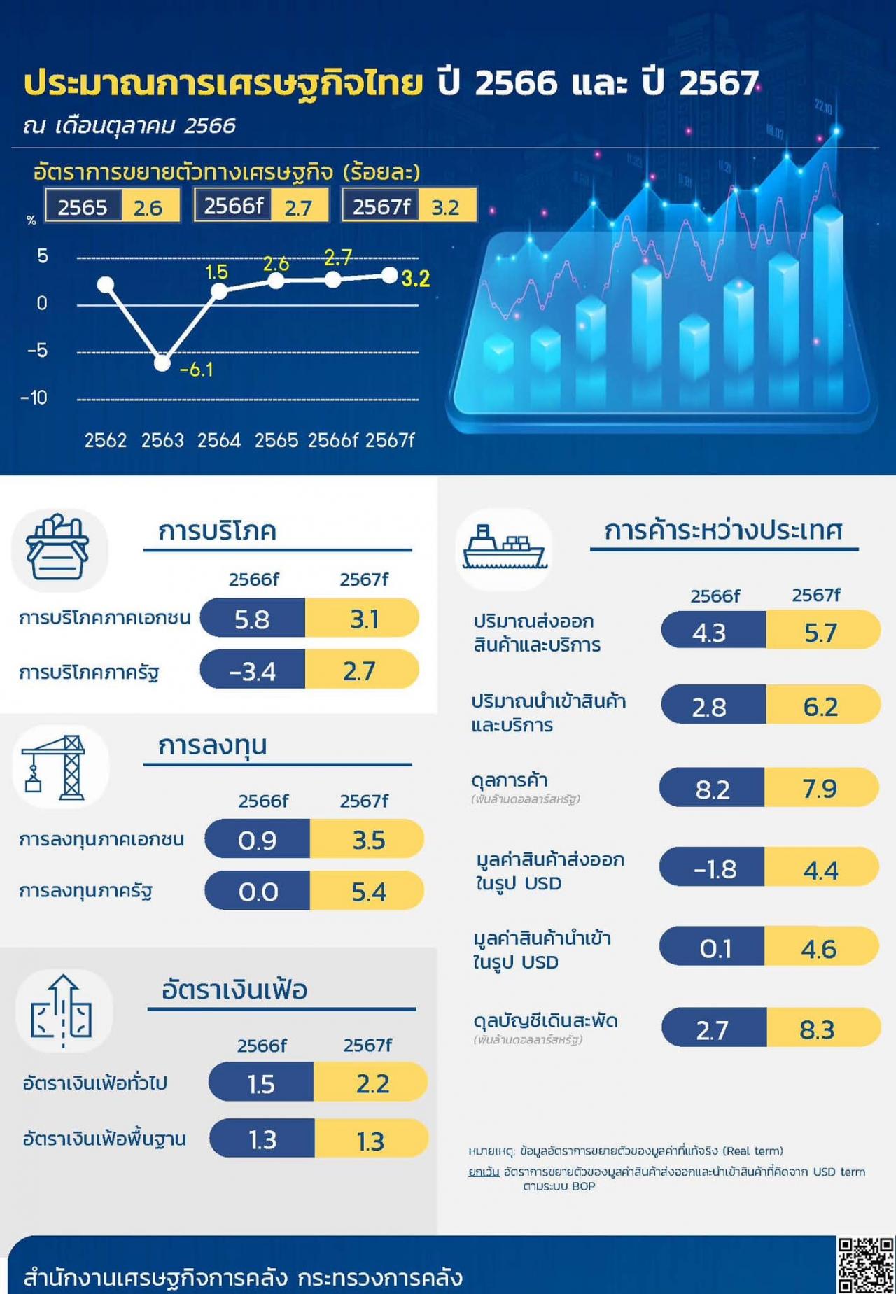 สำหรับในปี 2567 กระทรวงการคลังคาดว่าเศรษฐกิจไทยจะขยายตัวเร่งขึ้นที่ 3.2% ต่อปี หลังคาดว่าการส่งออกสินค้าจะกลับมาขยายตัวที่ 4.4% ส่งผลดีต่อความเชื่อมั่นของภาคธุรกิจ ทำให้คาดว่าการลงทุนภาคเอกชนจะขยายตัวได้ต่อเนื่อง พร้อมกับการฟื้นตัวอย่างเต็มที่ของการท่องเที่ยวไทย