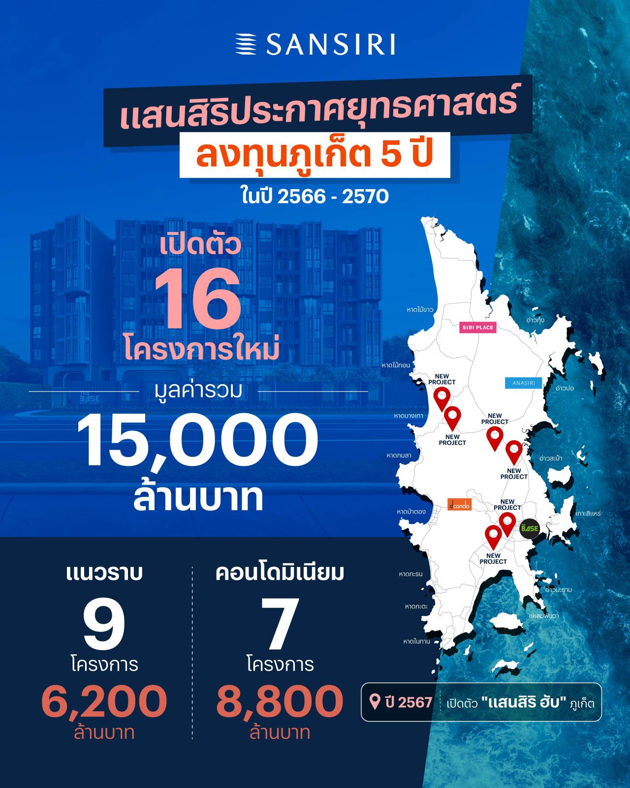 ThairathMoney เจาะความเคลื่อนไหวล่าสุดในแวดวงอสังหาฯ ไทย พบว่า บริษัท แสนสิริ จำกัด (มหาชน) ยกให้ จังหวัดภูเก็ตเป็น Strategic Location ในเชิงธุรกิจ ประกาศ เดินหน้าแผนลงทุนระยะยาว 5 ปี เปิด 16 โครงการใหม่ มูลค่า 15,000 ล้านบาท