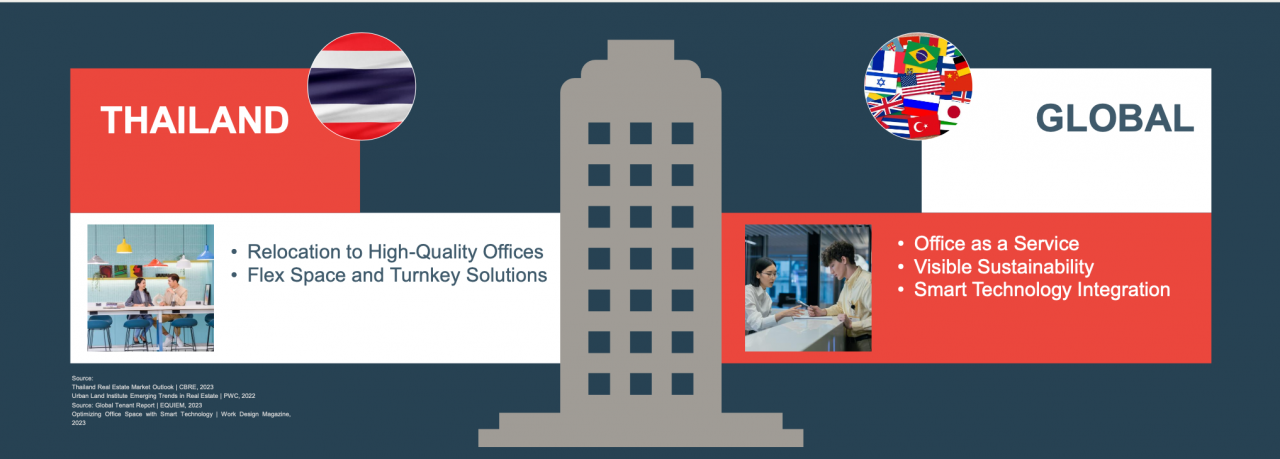 แต่ความต้องการของ ลูกค้าองค์กรชั้นนำ ทั้งบริษัทไทย และ บริษัทข้ามชาติ ในกลุ่มอาคารสำนักงานเกรด A ยังโดดเด่นน่าสนใจ ซึ่งมาจากเหตุผล 1. China-Plus One นโยบายการค้าใหม่ของจีน ผลักกลุ่มทุนออกนอกประเทศ โดยไทยน่าสนใจกว่าเวียดนาม เพราะโครงสร้างพื้นฐานประเทศพร้อมกว่า 2. เทรนด์การย้ายอาคาร จากเกรด B มาเกรด A 3.การเติบโตของกลุ่มธุรกิจใหม่ เช่น รถ EV, บริษัทเทคโนโลยี และกลุ่มอาหาร-ยา เป็นต้น