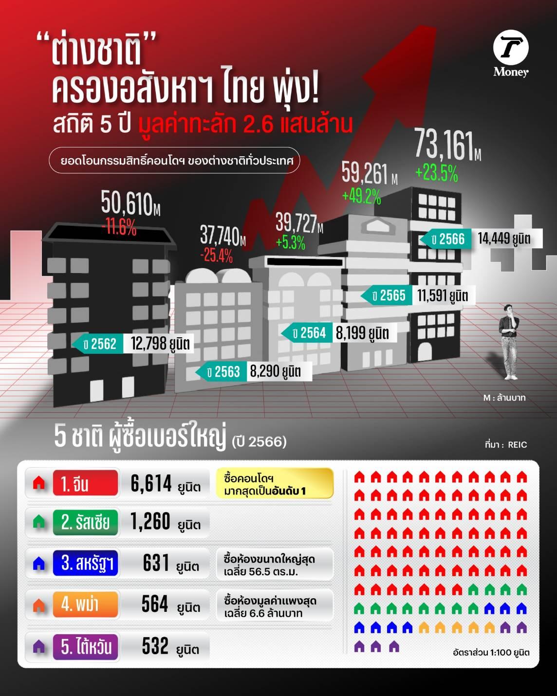 มากกว่า 2.6 แสนล้านบาท คือ มูลค่าการซื้อและโอนกรรมสิทธิ์คอนโดมิเนียมไทย ตามกฎหมาย 49% ต่อโครงการ ของกลุ่มชาวต่างชาติที่สามารถครอบครองได้ ในช่วงระยะเวลา 5 ปีที่ผ่านมา (2562 - 2566)