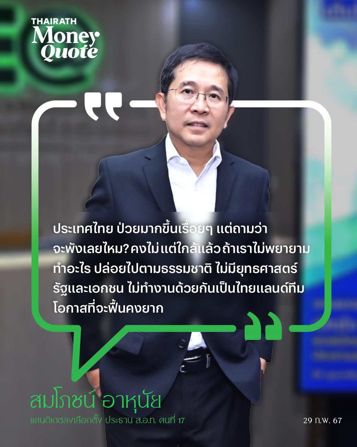 เมื่อ มหาเศรษฐี เบอร์ 9 เมืองไทย เจ้าพ่อพลังงานบริสุทธิ์ หรือ EA “สมโภชน์ อาหุนัย” ความร่ำรวยระดับแสนล้าน ประกาศลงสมัครท้าชิงเก้าอี้ ประธาน ส.อ.ท. คนที่ 17 วาระปี 2567-2569 แบบแทรกกลางเทอม จนกลายเป็นกระแสน่าจับตามอง ถึงเบื้องลึก การลงสมัครครั้งนี้ และมีภารกิจอย่างไร? ท่ามกลาง เศรษฐกิจไทย ถูกมอง ไม่ต่างจาก คนป่วยเป็น “มะเร็งร้าย” และ หลายอุตสาหกรรม นับวันยิ่งน่าห่วง ไม่สามารถแข่งขันได้ ในเวทีโลก อีกต่อไป