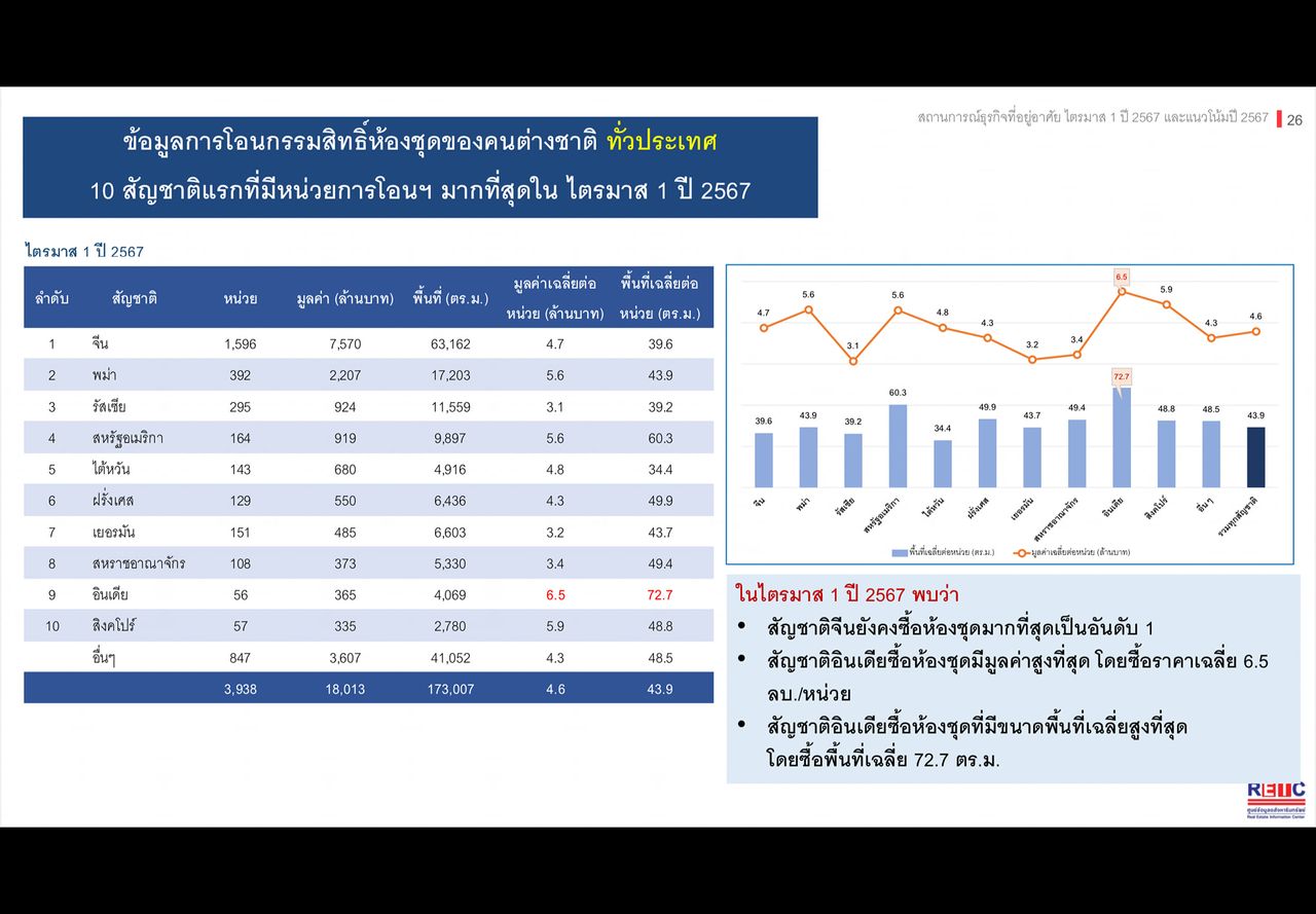 ภายใต้ตลาดอสังหาริมทรัพย์ไทยกำลังเผชิญกับ “กำลังซื้อ” คนไทยที่อ่อนแอ พบตลาดต่างชาติกลับเป็นไปอย่างคึกคัก โดยล่าสุด ศูนย์ข้อมูลอสังหาริมทรัพย์ไทย (REIC) รายงานว่า ไตรมาส 1 ปี 2567 ที่ผ่านมา มีต่างชาติโอนกรรมสิทธิ์ที่อยู่อาศัยไทย (คอนโดมิเนียม) เป็นจำนวนทั้งสิ้น 3,938 หน่วย (เพิ่มขึ้น 4.3%) มูลค่า 18,013 ล้านบาท (เพิ่มขึ้น 5.2%)