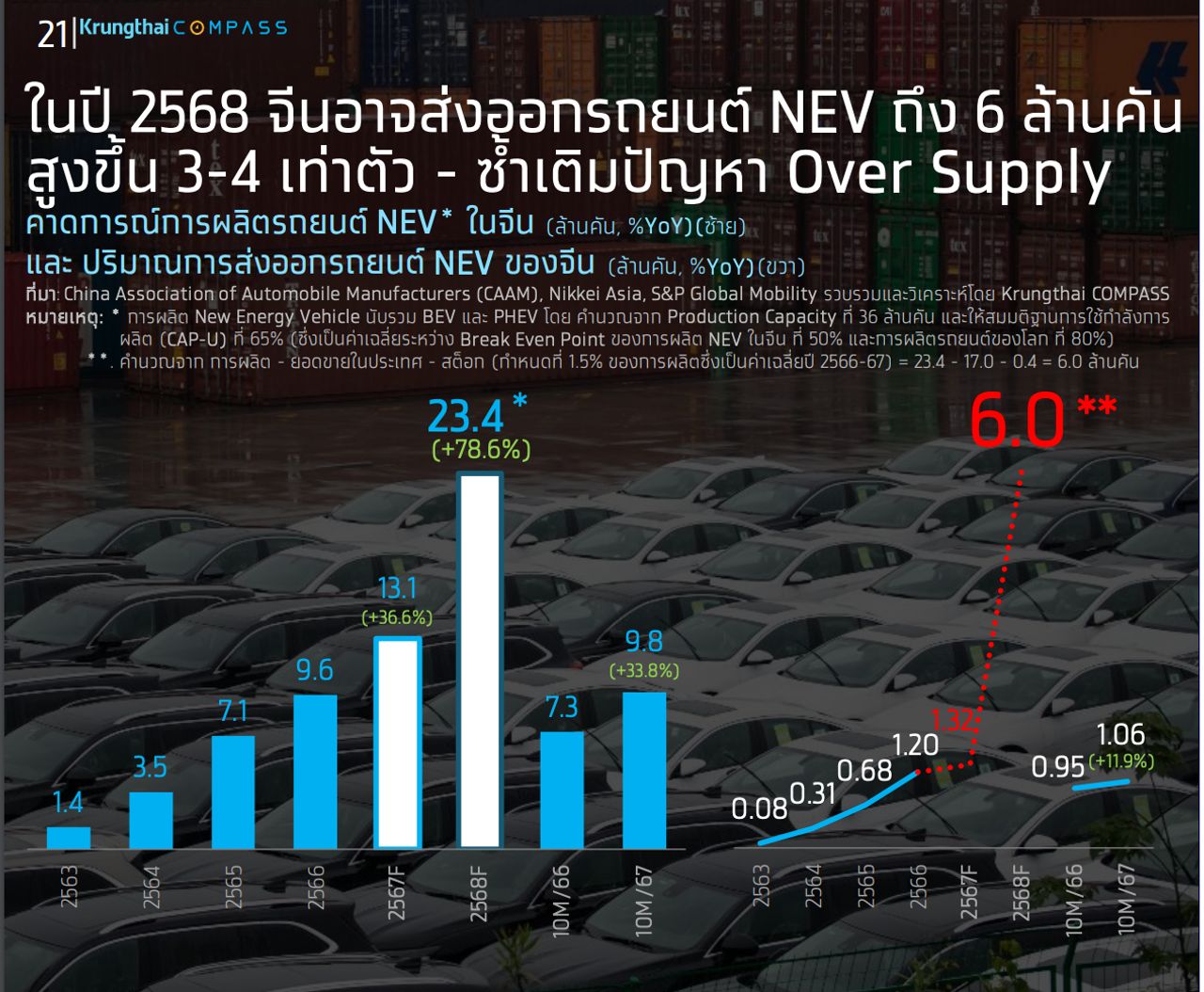 ขณะเดียวกัน ข้อมูลจาก Nikkei Asia ได้รายงานว่ากำลังการผลิตรถยนต์ NEV ในจีนมีแนวโน้มปรับตัวสูงขึ้นไปแตะระดับ 36 ล้านคัน ในปี 2568 และจีนจะส่งออกรถ NEV สู่ตลาดโลกถึง 6 ล้านคัน เพิ่มขึ้นจากปี 2567 ถึง 3-4 เท่าตัว ทำให้การแข่งขันด้านราคาอาจขยายเป็นวงกว้าง