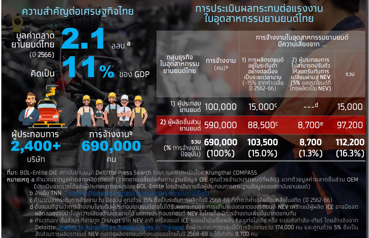 อย่างไรก็ดี ข้อมูลประเมินจาก Krungthai COMPASS ที่รวบรวมจากสถาบันยานยนต์, BOI และ Deloitte ระบุว่า ในอนาคตอันใกล้ คาดว่าแรงงานกว่า 110,000 คน ซึ่งเป็นสัดส่วนมากถึง 16.3% ของอุตสาหกรรมยานยนต์ไทย มีความเสี่ยงที่ต้องย้ายไปทำงานในอุตสาหกรรมอื่นๆ แทน