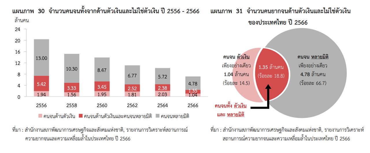 รายงานภาวะสังคมไทยปี 2567 จาก สภาพัฒน์ฯ (สำนักงานสภาพัฒนาการเศรษฐกิจและสังคมแห่งชาติ) ชี้ว่า แม้ภาพรวมความยากจนหลายมิติในประเทศไทยดีขึ้น จากการเติบโตทางเศรษฐกิจในช่วง 10 ปีที่ผ่านมา แต่ยังมีคนไทยจำนวนมากที่ประสบปัญหานี้ ที่ทั้งยากจนด้านการเงินและคุณภาพชีวิต