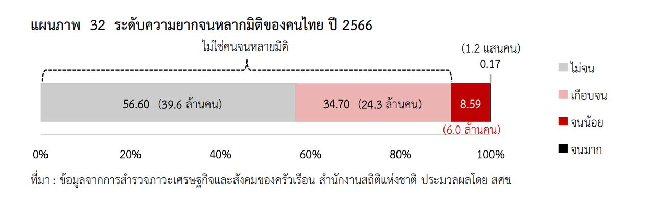ประเด็นที่น่าสนใจ คือ มีคนไทยอีกกว่า 24 ล้านคน ที่เสี่ยงต่อการเป็นคนจนหลายมิติ เมื่อพิจารณาคนจนหลายมิติ ตามระดับความรุนแรง พบว่า คนจนหลายมิติโดยส่วนใหญ่เป็นคนจนน้อย โดยมีความขัดสนมากกว่า 1 มิติ แต่ไม่ถึง 2 มิติ จาก 4 มิติ สะท้อนให้เห็นว่าประเทศไทยมีโอกาสมากในการลดจำนวนคนจนหลายมิติลงได้อีก