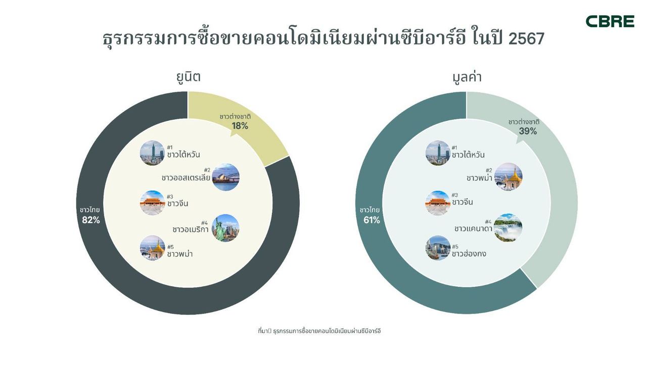 ขณะข้อมูลที่น่าสนใจพบว่า จากการปิดการขายโครงการคอนโดมิเนียมระดับลักชัวรีขึ้นไป โดยซีบีอาร์อี ณ สิ้นปี 2567 พบว่า มีสัดส่วนจำนวนยูนิตที่ขายได้จากลูกค้าชาวไทยอยู่ที่ 82% และลูกค้าชาวต่างชาติ 18%