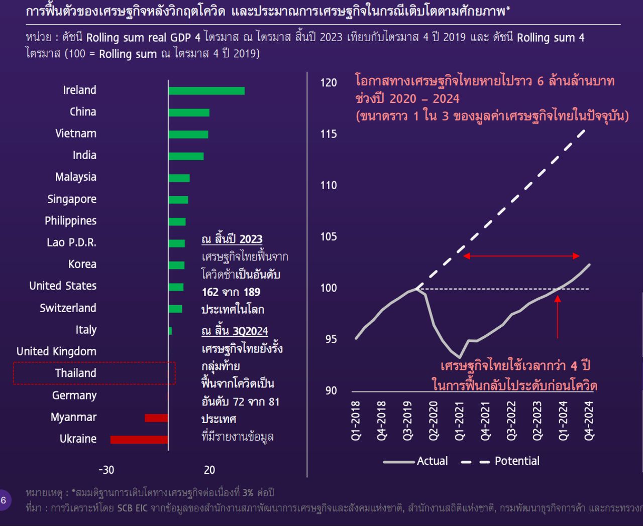 ทั้งนี้ ยังพบว่า “เศรษฐกิจไทย” ฟื้นตัวช้าหลังโควิด-19 รั้งท้ายติดอันดับโลก เป็นอันดับ 72 จาก 81 ประเทศ ที่มีรายงานข้อมูล โดย SCB EIC ยังชี้ว่า ช่วงปี 2020-2024 โอกาสทางเศรษฐกิจไทยได้หายไปราว 6 ล้านล้านบาท ซึ่งเป็นมูลค่ามากขนาด 1 ใน 3 ของมูลค่าเศรษฐกิจไทยในปัจจุบัน และได้ใช้เวลากว่า 4 ปี ในการฟื้นกลับไประดับก่อนโควิด