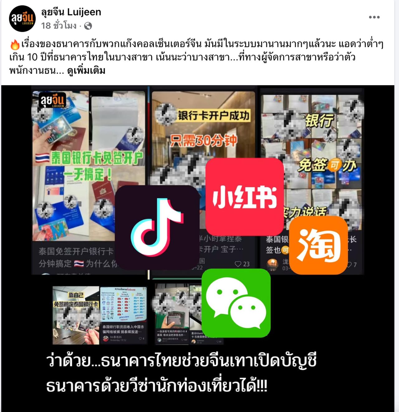 สืบเนื่องจาก กรณีเพจดัง "ลุยจีน Luijeen" ผู้ติดตาม 1.4 ล้านคน โพสต์บอกเล่า ประเด็น “ชาวจีน” จำนวนไม่น้อยสามารถเปิดบัญชีธนาคารในไทยได้อย่างง่ายดาย แม้จะถือเพียงวีซ่าท่องเที่ยว