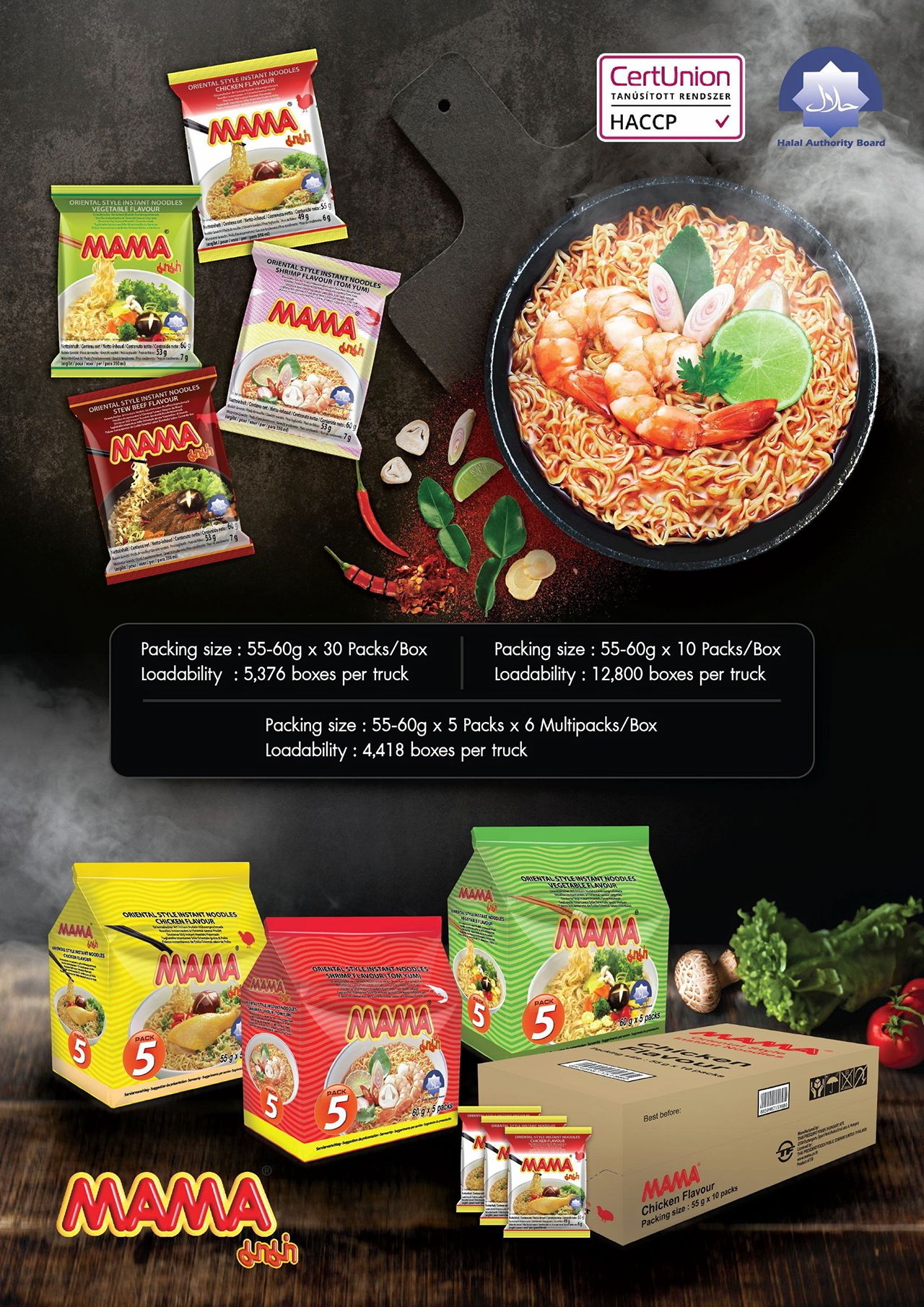 “ปัจจุบันมาม่าได้มีการทำตลาดในประเทศต่างๆทุกภูมิภาคทั่วโลก ภายใต้แบรนด์ “มาม่า” เป็นภาษาไทย ซึ่งล้วนแต่ขายดี โดยมีโรงงานผลิตบะหมี่กึ่งสำเร็จรูป “มาม่า” ตั้งอยู่นอกประเทศไทย อยู่ 4 โรงงานขนาดใหญ่ ได้แก่ กัมพูชา เมียนมา บังกลาเทศ และฮังการี ตามลำดับ”