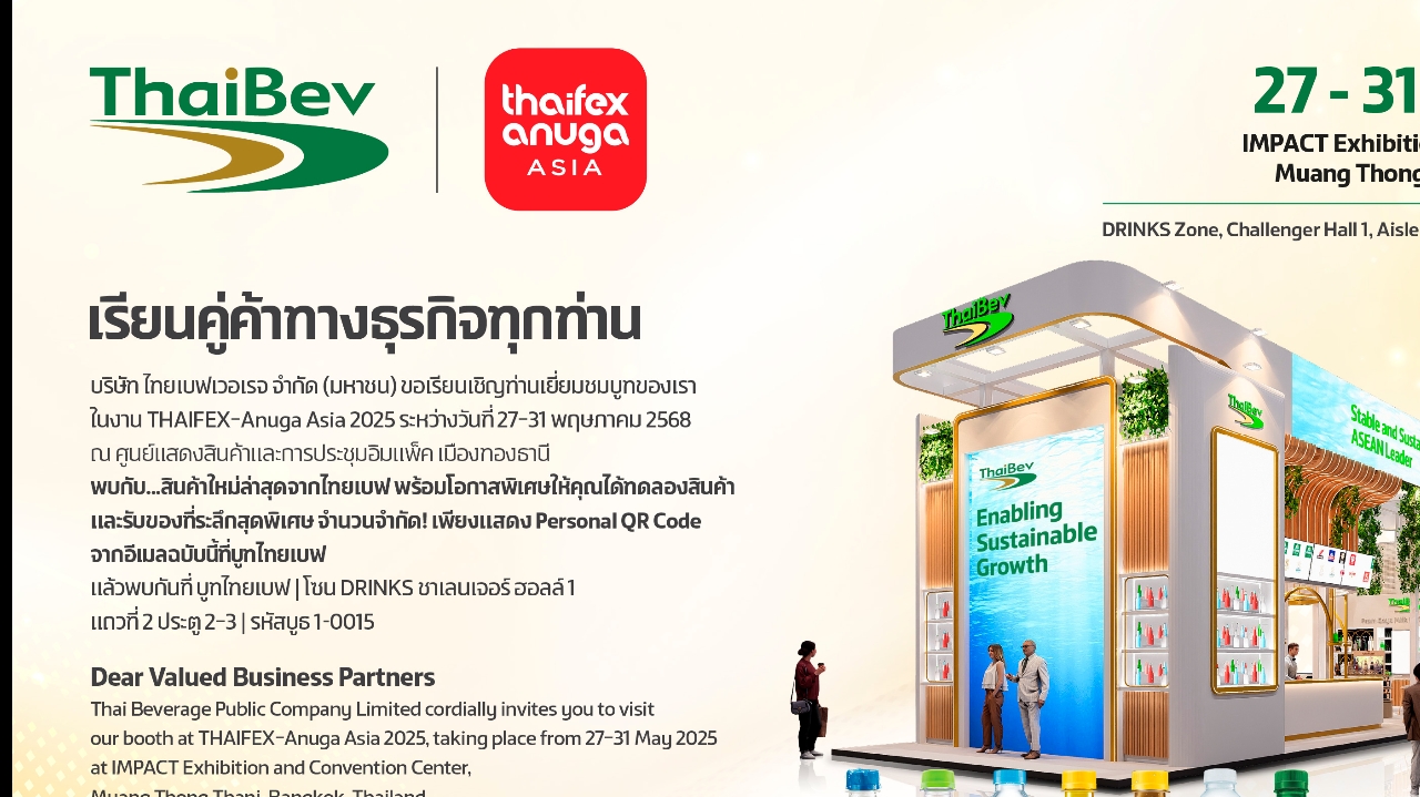 ผู้สื่อข่าวรายงานว่า บริษัท ไทยเบฟเวอเรจ จำกัด (มหาชน) หรือ กลุ่มบริษัทไทยเบฟ ขอเชิญชวนประชาชนมาสัมผัสประสบการณ์สุดพิเศษ กับผลิตภัณฑ์นวัตกรรมแห่งยุค และผลิตภัณฑ์ใหม่ ภายในงาน “THAIFEX – ANUGA ASIA 2025” ระหว่างวันที่ 27 - 31 พ.ค.นี้ ตั้งแต่เวลา 10.00 - 20.00 น. ท่ี ศูนย์การประชุม และแสดงสินค้าอิมแพ็ค อารีน่า เมืองทองธานี ผู้เข้าชมงานจะได้พบกับ กิจกรรมท่ีผ่านการ สรรสร้าง ความหลากหลายตอบโจทย์ ความต้องการผู้บริโภคทุกช่วงวัย ตอกย้ำศักยภาพความแข็งแกร่ง ผู้นำธุรกิจเครื่องดื่ม และอาหารครบวงจรที่มั่นคง ยั่งยืนของอาเซียน ที่ขับเคลื่อนธุรกิจควบคู่ไปกับการคำนึง ถึงสังคม สิ่งแวดล้อม พร้อมขยายการเติบโตทางธุรกิจ ไปต่างประเทศ