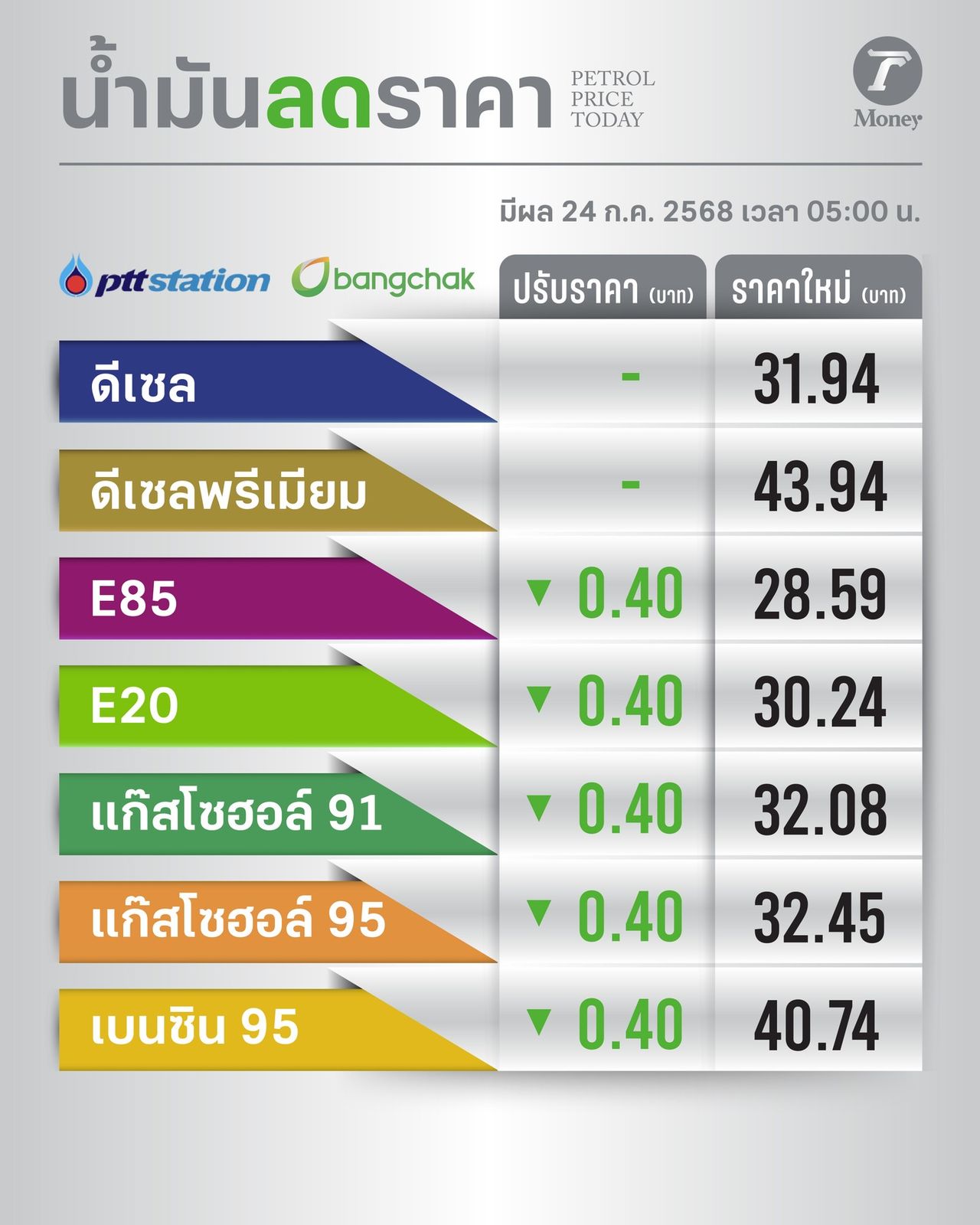 ผู้สื่อข่าวรายงานว่า พีทีที สเตชั่น และ บมจ.บางจากปิโตรเลียม หรือ BCP ประกาศปรับลดราคาน้ำมันกลุ่มเบนซิน-แก๊สโซฮอล์ 40 สตางค์ ขณะที่กลุ่มดีเซลราคาคงเดิม เริ่มมีผลตั้งแต่เวลา 05.00 น.วันที่ 24 ก.ค. 2568