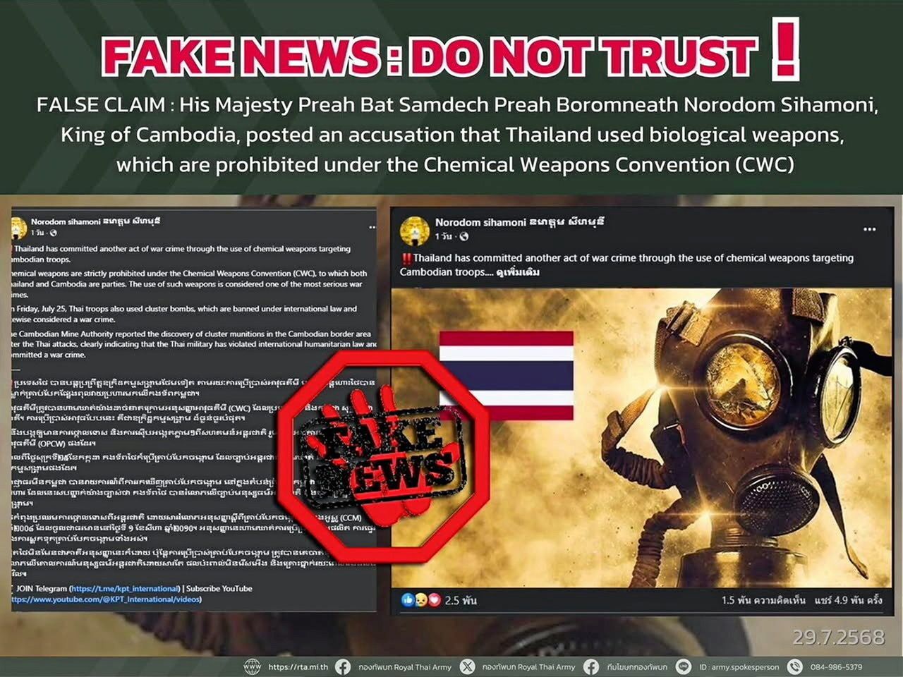 ในห้วงเวลาที่ชายแดนยังคงร้อนระอุ และไม่รู้ว่าเสียงปืนจะปะทุขึ้นอีกเมื่อใด กัมพูชายังคงเดินเกมใช้ข่าวปลอมเป็นอาวุธบิดเบือนความจริง ปั่นกระแสโลกให้เข้าข้างตนเอง พร้อมเร่งสร้างกระแสชาตินิยม ทำให้ประชาชนกัมพูชาร่วมกันเดินหน้ากดดันไทยไม่หยุดหย่อน