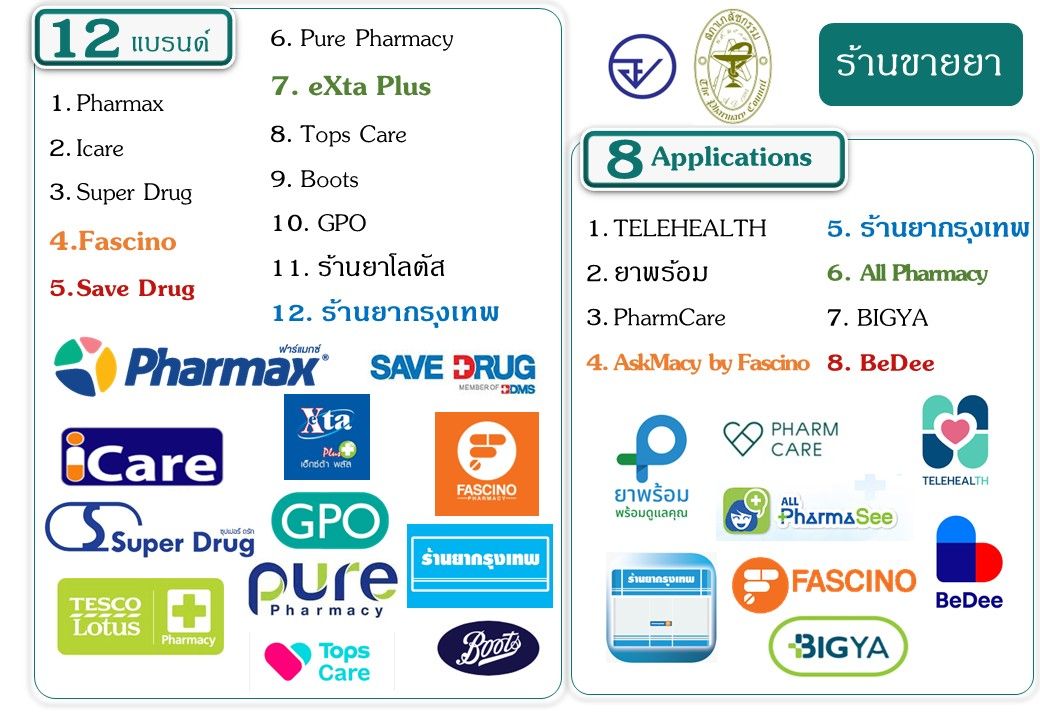 รวมทั้งผู้ให้บริการจำหน่ายยาผ่านแพลตฟอร์มออนไลน์ (Applications) เข้าร่วมด้วย ได้แก่ Telehealth, ยาพร้อม, PharmCare, AskMacy by Fascino, ร้านยากรุงเทพ, All Pharmacy และ BIGYA ซึ่งมีเภสัชกรประจำให้คำปรึกษาแนะนำอย่างใกล้ชิด