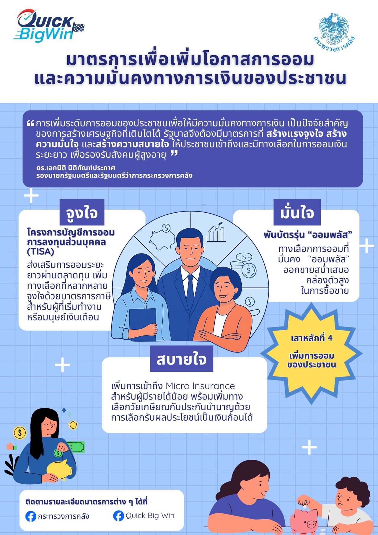 นายเอกนิติ นิติทัณฑ์ประภาศ รองนายกรัฐมนตรีและรมว.คลัง เปิดเผยภายหลังเป็นประธานประชุมคณะกรรมการนโยบายเศรษฐกิจ (ครม.เศรษฐกิจ) แทนนายกรัฐมนตรี ว่า ที่ประชุมเห็นชอบมาตรการ Quick Big Win การเพิ่มโอกาสการออมและความมั่นคง ซึ่งเป็นเสาที่ 4 ภายใต้นโยบาย 5 เสาหลัก เพื่อเพิ่มโอกาสการออมและความมั่นคงทางการเงิน รวมทั้งรองรับการเข้าสู่สังคมสูงอายุ