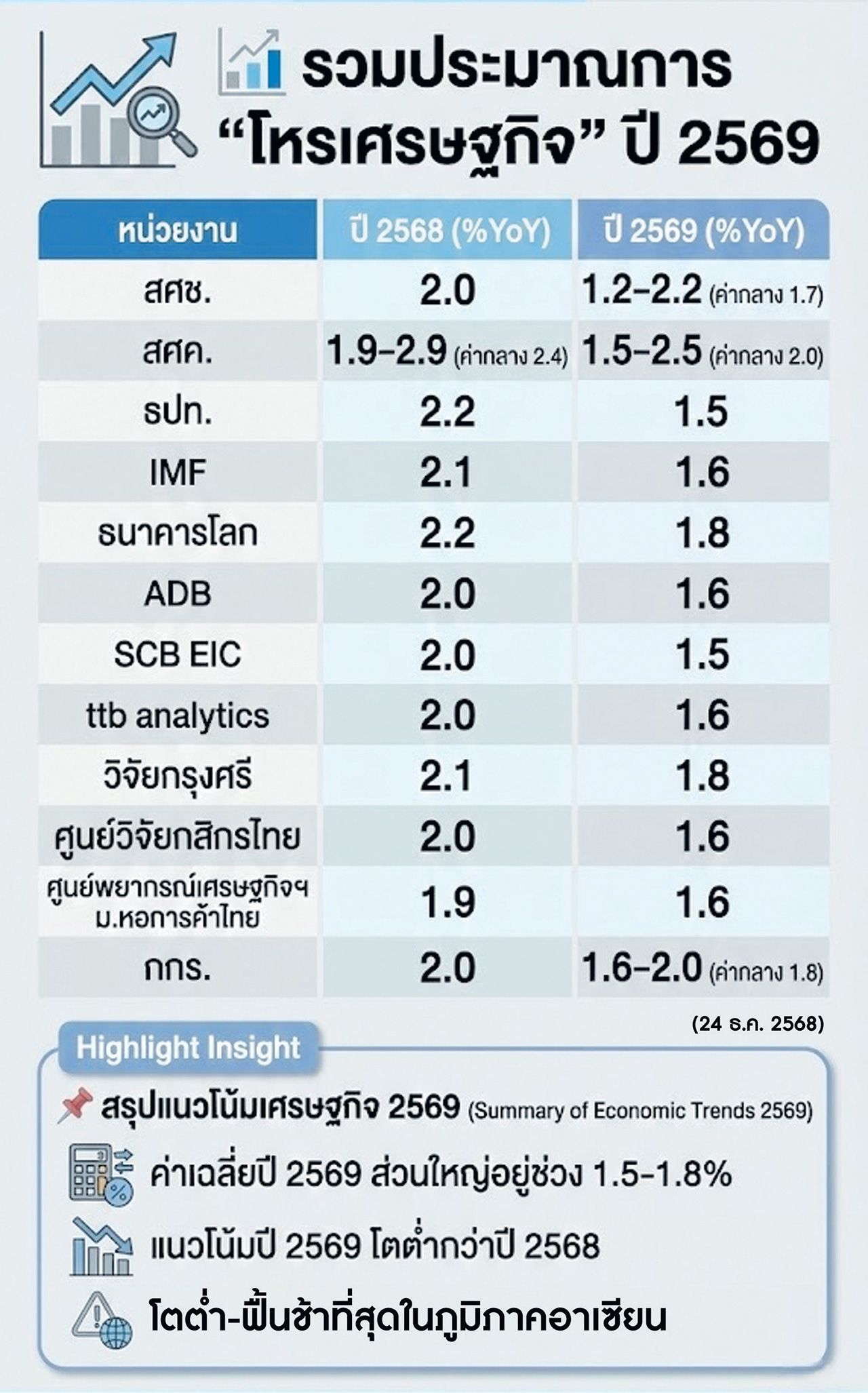 โดยคาดว่าเศรษฐกิจปี 2569 จะเป็นปีแรกในรอบ 30 ปี ที่ประเทศไทยจะขยายตัวต่ำกว่า 2% โดยไม่ได้อยู่ในช่วงวิกฤติเศรษฐกิจ ปีม้าเหนื่อยของเราจะวิ่งช้าๆ โตเฉลี่ยเพียง 1.6% และที่น่าเป็นห่วง คือ อาการดังกล่าวชี้ว่า ประเทศไทยของเรากำลังเข้าสู่ “ยุคเศรษฐกิจโตต่ำ” และเสี่ยงที่จะกลายเป็น “คนไข้” คนใหม่ของเอเชีย