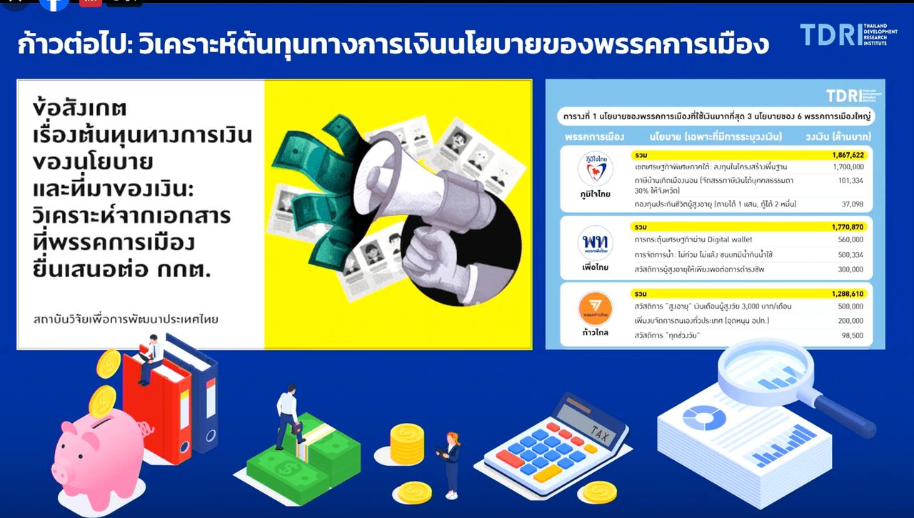 แต่ในขณะที่พรรคการเมืองกำลังแย่งกัน “ให้” คำถามที่คนทำงานและคนชั้นกลางต้องตั้งร่วมกันคือ “เราจะเอาเงินมาจากไหน?” และ “ใครจะเป็นคนจ่ายบิลใบนี้?” เพราะข้อมูลจากเวทีเสวนา “เขาแจก แต่เราจ่าย... ถึงเวลาประชา (ต้องเลิก) นิยม” โดย TDRI หรือ สถาบันวิจัยเพื่อการพัฒนาประเทศไทย สะท้อนว่า ฐานะการคลังของไทยกำลังเดินหน้าเข้าใกล้วิกฤติ