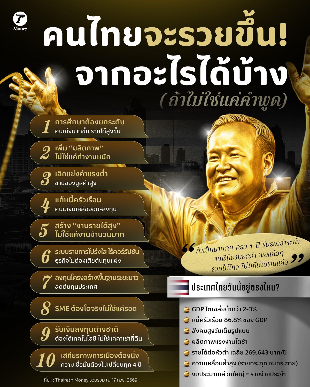 การที่คนไทยยังไม่รวย ไม่ใช่เพราะความขี้เกียจ แต่เป็นเพราะ "โครงสร้าง" ที่กดทับศักยภาพเอาไว้ หากต้องการให้คนไทยมีเงินล้นกระเป๋าใน 4 ปีข้างหน้า นี่คือ 10 เสาหลักที่ต้องเปลี่ยน จากฐานข้อมูลจริง ,ข้อเสนอแนะของนักวิชาการ และ งานวิจัยทางเศรษฐกิจต่างๆ