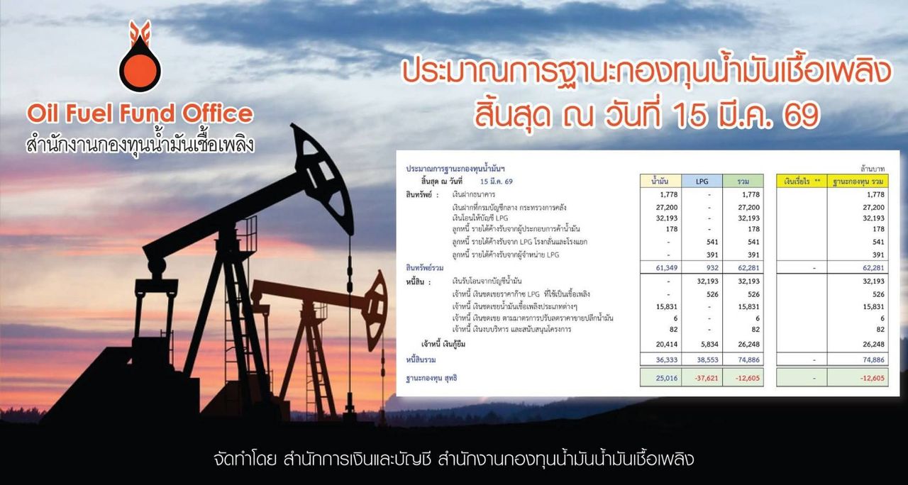 ข้อมูลฐานะกองทุนล่าสุดระบุว่า สถานะสุทธิของกองทุน ณ วันที่ 15 มีนาคม 2569 ยัง ติดลบราว 12,605 ล้านบาท